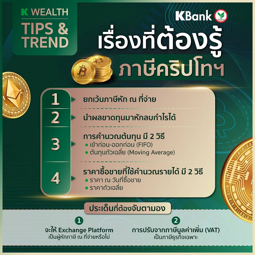 3. วิธีการคิดต้นทุน สามารถทำได้ 2 วิธี คือ 1) คิดด้วยวิธี “เข้าก่อน-ออกก่อน” (First in, First out หรือที่เรียกว่า FIFO) และ 2) วิธีต้นทุนถัวเฉลี่ยเคลื่อนที่ (Moving Average Cost) ยกตัวอย่างเช่น วันที่ 1 ก.พ. ซื้อคริปโท A จำนวน 1 เหรียญในราคา 10,000 บาท/เหรียญคริปโท ต่อมาในวันที่ 3 ก.พ. ซื้อเพิ่มอีก 1 เหรียญในราคา 12,000 บาท ถ้าใช้วิธี “เข้าก่อน-ออกก่อน” (FIFO) ในการคิดต้นทุนเมื่อจะขายออก 1 เหรียญ จะใช้ราคาของเหรียญที่ซื้อเข้ามาก่อน นั่นคือ 10,000 บาท แต่ถ้าใช้วิธีต้นทุนถัวเฉลี่ยเคลื่อนที่ ทั้งสองเหรียญจะมีต้นทุนเฉลี่ย 11,000 บาท คือนำราคาซื้อทั้งหมดมารวมกันหารด้วยจำนวนเหรียญ
