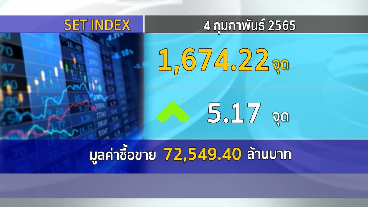 กทม. 4 ก.พ.-ตลาดหลักทรัพย์ ปิดวันนี้ที่ระดับ 1,674.22 จุด เพิ่มขึ้น 5.17 จุด (+0.31%) มูลค่าการซื้อขาย 72,549.40 ล้านบาท หุ้นไทยวันนี้ปรับตัวขึ้น หลังผลประกอบการของบริษัทสหรัฐที่เป็นหุ้นขนาดใหญ่หลายตัวออกมาดี