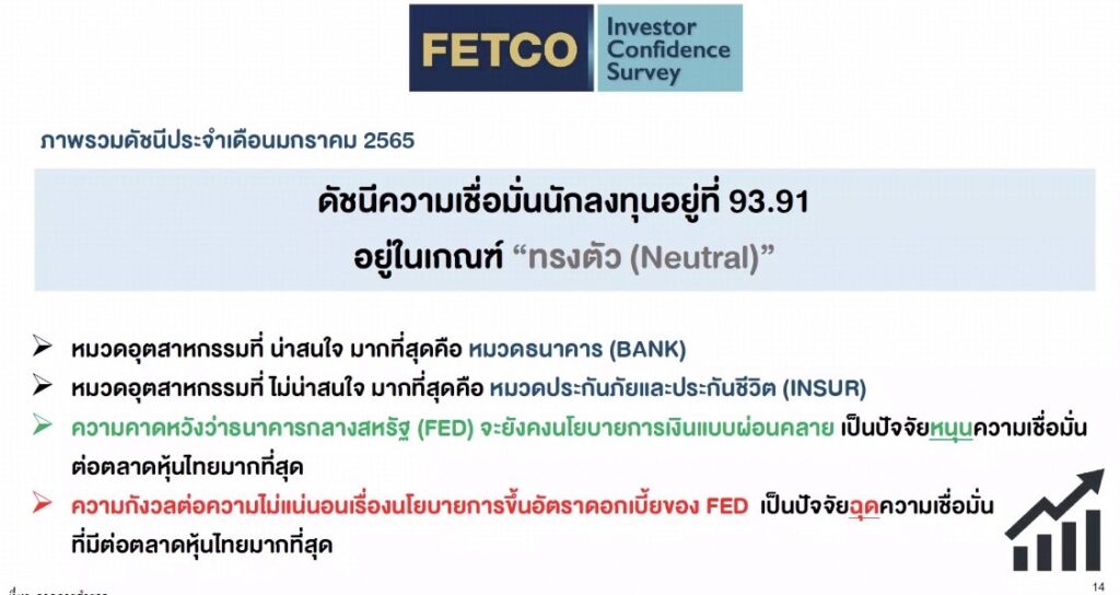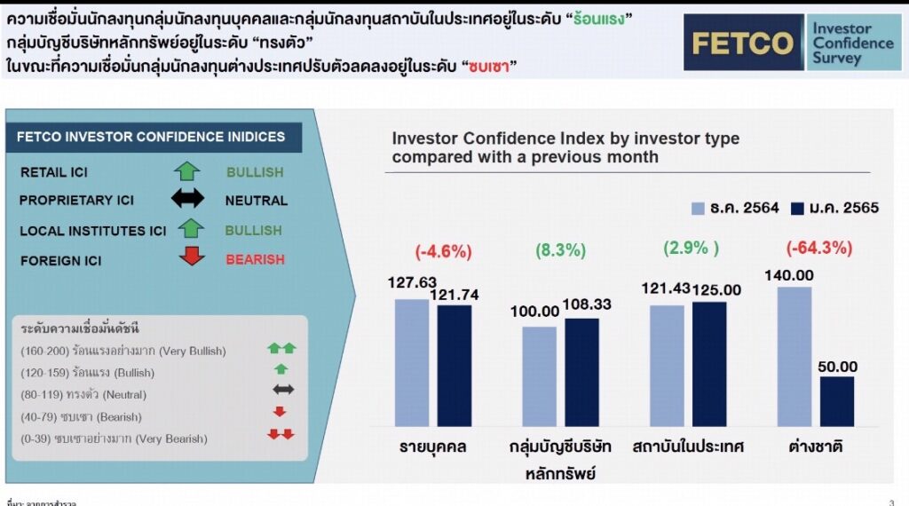 นายไพบูลย์ นลินทรางกูร ประธานกรรมการสภาธุรกิจตลาดทุนไทย แถลงดัชนีความเชื่อมั่นนักลงทุนประจำเดือนกุมภาพันธ์ 65 อยู่ในระดับ 93.91 อยู่ในเกณฑ์ ทรงตัว โดยกลุ่มนักลงทุนทั่วไป และนักลงทุนสถาบัน “ยังร้อนแรง” กลุ่มบัญชีบริษัทหลักทรัพย์ ยังมองตลาด “ทรงตัว” ขณะที่ต่างชาติ “ซบเซา” ยอมรับว่า ปัญหาโควิด-19 นักลงทุนกังวลน้อยลง เพราะความรุนแรงของโอมิครอนไม่มากนัก แต่กังวลเกี่ยวกับการปรับเพิ่มดอกเบี้ยของเฟด ในปีนี้ช่วงเดือน มี.ค.-เม.ย.65 ประมาณ 5 ครั้ง หรือขยับเพิ่มประมาณร้อยละ 1.25 เพื่อให้เข้าใกล้ระดับเดิมก่อนโควิด ช่วง 3 ปีก่อน จากดอกเบี้ยนโยบายเคยอยู่ร้อยละ 1.5