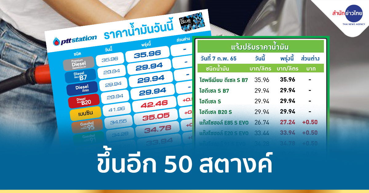 กทม. 7 ก.พ.- ผู้ค้าแจ้งปรับราคาน้ำมันทุกชนิด 50 สตางค์/ลิตร ส่วนกลุ่มดีเซลคงเดิม มีผลพรุ่งนี้ (8 ก.พ.65)