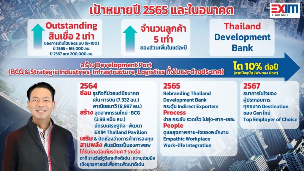 นายรักษ์ วรกิจโภคาทร กรรมการผู้จัดการ EXIM BANK แถลง “EXIM BANK : Thailand Game Changer” ในโอกาสครบรอบ 28 ปีธนาคาร พร้อมทั้งผลการดำเนินงานปี 2564 ว่า EXIM BANK ตั้งเป้าหมายมุ่งให้สินเชื่อในกลุ่มอุตสาหกรรมแห่งอนาคต ธุรกิจ BCG เช่น กลุ่มพลังงานทดแทน อุตสาหกรรมสีเขียว (Green) รองรับกระแสรักษ์โลก อุตสาหกรรมดิจิทัล (Digital) รองรับไลฟ์สไตล์สร้างความสะดวกสบาย ตอบสนองความต้องการผ่านการค้าออนไลน์ และอุตสาหกรรมเพื่อสุขภาพ (Health) สอดรับกระแสการดูแลสุขภาพ เพราะกลุ่มเหล่านี้เติมโตได้ท่ามกลางโควิด-19 จึงให้สินเชื่อสัดส่วนร้อยละ 75