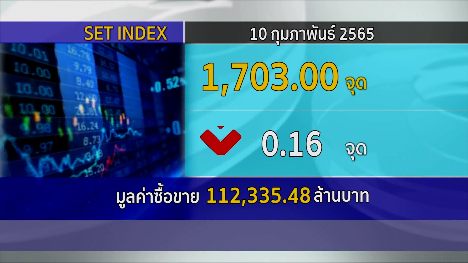 กทม. 10 ก.พ.- ตลาดหลักทรัพย์ ปิดวันนี้ที่ระดับ 1,703.00 จุด ลดลง 0.16 จุด (-0.01%) มูลค่าการซื้อขาย 112,335.48 ล้านบาท