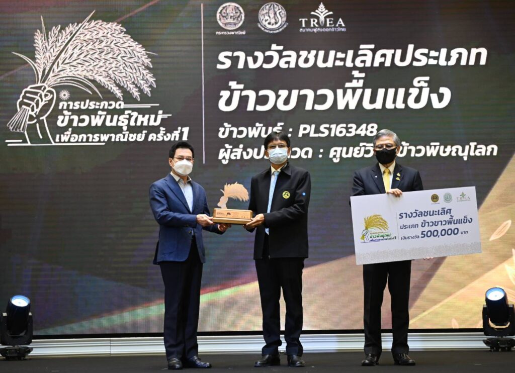 ทั้งนี้ ขอแสดงความยินดีแก่ผู้ชนะการประกวดพันธุ์ข้าวในครั้งนี้ ผู้ได้รับรางวัลการประกวดข้าวพันธ์ใหม่เพื่อการพาณิชย์ประกอบด้วย รางวัลชนะเลิศ ประเภทข้าวหอมไทย ได้แก่ ข้าวพันธุ์ PTT13030 ศูนย์วิจัยข้าวปทุมธานี รางวัลชมเชย ประเภทข้าวหอมไทย ได้แก่ ข้าวพันธุ์ BioH95-CNT ศูนย์วิจัยข้าวชัยนาท รางวัลชนะเลิศ ประเภทข้าวขาวพื้นนุ่ม ได้แก่ ข้าวพันธุ์ RJ44 บริษัท รวมใจพัฒนาความรู้ จำกัด (มูลนิธิรวมใจพัฒนา) รางวัลชมเชย ประเภท ข้าวขาวพื้นนุ่ม ได้แก่ ข้าวพันธุ์ CNT15171 ศูนย์วิจัยข้าวชัยนาท รางวัลชนะเลิศ ประเภท ข้าวขาวพื้นแข็ง ได้แก่ ข้าวพันธุ์ PLS16348 ศูนย์วิจัยข้าวพิษณุโลก รางวัลชมเชย ประเภท ข้าวขาวพื้นแข็ง ได้แก่ ข้าวพันธุ์ CNT07001 ศูนย์วิจัยข้าวชัยนาท .-สำนักข่าวไทย