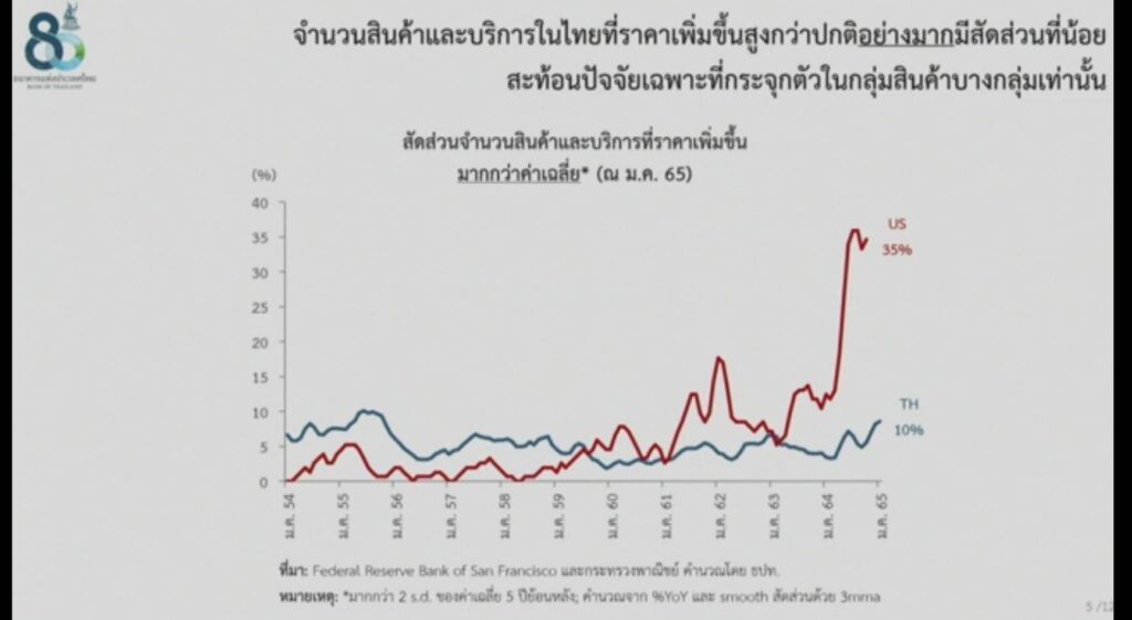 นายสุรัช แทนบุญ ผู้อำนวยการอาวุโส ฝ่ายนโยบายการเงิน ธปท. กล่าวว่า ที่ผ่านมาเป็นการปรับขึ้นราคาสินค้าเฉพาะบางหมวด ไม่ได้มีการเพิ่มขึ้นในหลาย ๆ สินค้าพร้อมกันเป็นวงกว้าง และไม่เห็นการเพิ่มขึ้นของราคาแบบยกแผง ซึ่งมีสินค้าจำนวนมากเกือบ 200 รายการในตะกร้าเงินเฟ้อที่ราคาที่คงที่หรือลดลง เช่น ข้าว และค่าเล่าเรียน สำหรับเงินเฟ้อในระยะต่อไป แนวโน้มของราคาน้ำมันรวมถึงการคลี่คลายของปัญหาการขาดแคลนเซมิคอนดักเตอร์ ตู้คอนแทนเนอร์ และเนื้อหมู จะช่วยให้อัตราเงินเฟ้อปรับลดลงได้ อีกทั้งกำลังซื้อที่เพิ่งเริ่มฟื้นตัวส่งผลให้แรงกดดันเงินเฟ้อด้านอุปสงค์อยู่ในระดับต่ำ ปัจจุบันยังไม่เห็นสัญญาณการขึ้นราคาในหลายหมวดสินค้าพร้อม ๆ กัน โดยข้อมูลล่าสุดเดือน ม.ค.65 มีการเพิ่มขึ้นของสินค้ากลุ่มน้ำมันเชื้อเพลิงและเนื้อสัตว์เป็นหลัก ขณะที่สินค้าและบริการอีก 188 รายการจาก 430 รายการมีราคาทรงตัวหรือลดลง แต่ยังต้องติดตามต่อเนื่องว่าจะมีการเพิ่มขึ้นในสินค้าประเภทใดอีกบ้างในระยะต่อไป