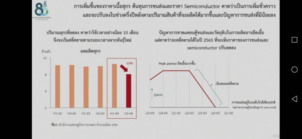 นายสุรัช กล่าวว่า ธปท.คาดว่าราคาน้ำมันจะเริ่มลดลงได้ในช่วงไตรมาส 2/65 แต่ก็ขึ้นอยู่กับสถานการณ์ตลาดโลก ที่ต้องติดตาม โดยไทยก็ยังมีกลไกกองทุนน้ำมันเชื้อเพลิง เข้าไปดูแลเสถียรภาพราคาน้ำมันอยู่ ขณะที่ราคาเนื้อหมูคาดว่าจะปรับลดลงในช่วงครึ่งหลังของปี โดยใช้เวลาอย่างน้อยประมาณ 10 เดือนสถานการณ์ปริมาณหมูที่ลดลงจึงจะเริ่มคลี่คลาย