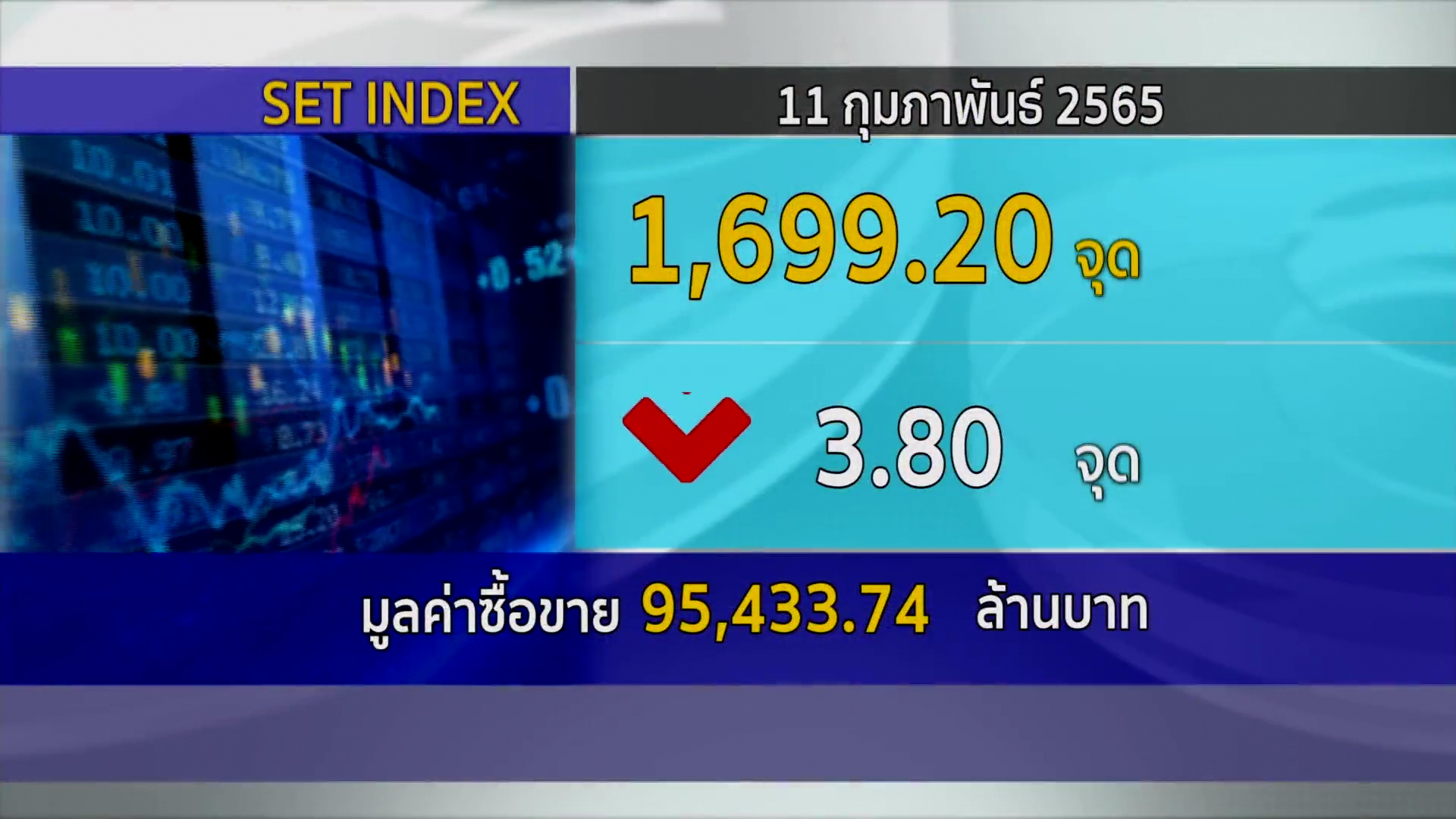 กทม. 11 ก.พ.- ตลาดหลักทรัพย์ ปิดวันนี้ที่ระดับ 1,699.20 จุด ลดลง 3.80 จุด (-0.22%) มูลค่าการซื้อขาย 95,433.74 ล้านบาท
