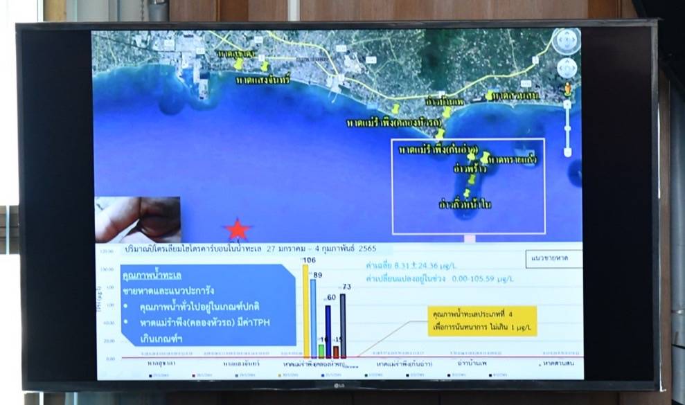 ระยอง 14 ก.พ. – ปลัดกระทรวงทรัพยากรธรรมชาติและสิ่งแวดล้อมตรวจสถานการณ์เหตุน้ำมันดิบรั่วไหลจากท่อใต้ทะเลบริเวณมาบตาพุด จ. ระยองเป็นครั้งที่ 2 โดยพบเพียงคราบน้ำมันในลักษณะฟิล์มใสบางๆ ไม่มาก ห่างจากฝั่งประมาณ 5-6 กิโลเมตร สั่งทุกหน่วยติดตามผลกระทบต่อทรัพยากรทางทะเลและชายฝั่งเพื่อเรียกค่าเสียหายจากบริษัท SPRC