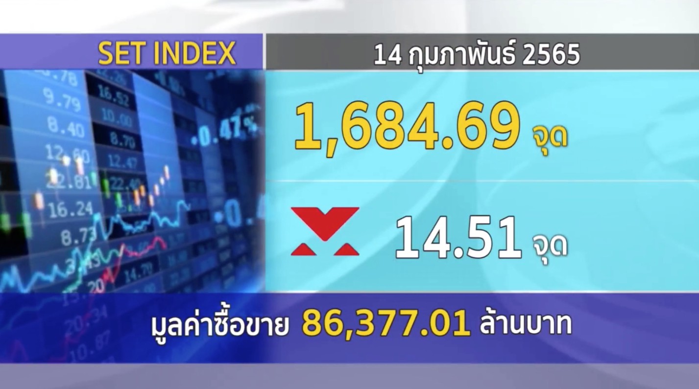 กทม. 14ก.พ.-ตลาดหลักทรัพย์ ปิดวันนี้ที่ระดับ 1,684.69 จุด ลดลง 14.51 จุด (-0.85%) มูลค่าการซื้อขาย 86,377.01 ล้านบาท หุ้นไทยวันนี้ปรับลงตามตลาดหุ้นต่างประเทศ ตอบรับสถานการณ์ความตึงเครียดรัสเซีย-ยูเครน ยังไม่ชัดเจน และมีการปล่อยข่าวออกมาต่อเนื่องสร้าง