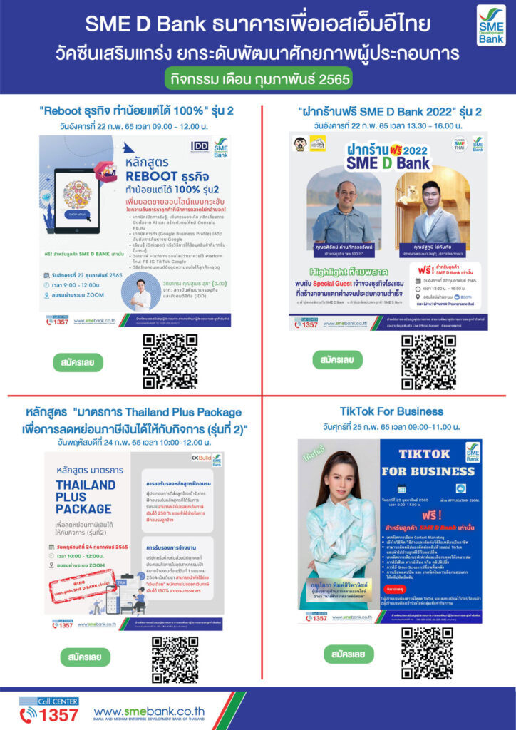 กรุงเทพฯ 15 ก.พ -SME D Bank เดินหน้าพัฒนายกระดับเอสเอ็มอีไทย คลอดโปรแกรมเติมความรู้ เดือน ก.พ. 65 หนุนรวยด้วยออนไลน์