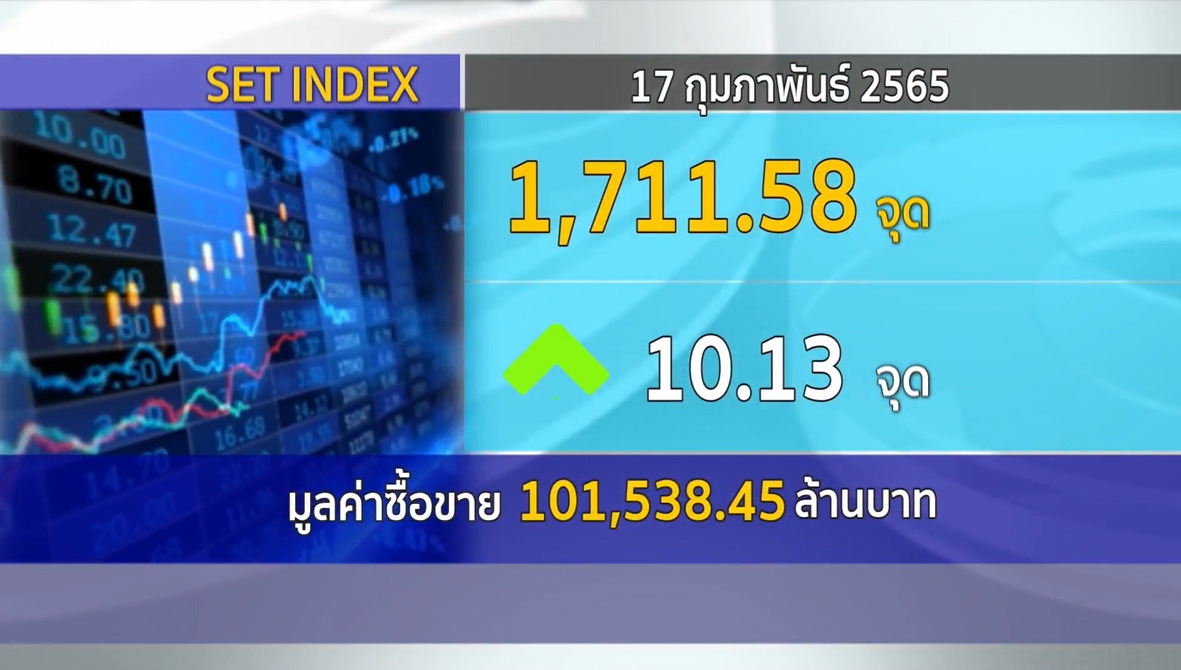 กทม. 17 ก.พ.-ตลาดหลักทรัพย์ ปิดวันนี้ที่ระดับ 1,711.58.58 จุด เพิ่มขึ้น 10.13 จุด (+0.60%) มูลค่าการซื้อขาย 101,538.45 ล้านบาท ตลาดหุ้นไทยวันนี้ปรับตัวขึ้นได้ดี ตอบรับเม็ดเงินของนักลงทุนต่างชาติไหลเข้ามาต่อเนื่อง โดยมีแรงซื้อเข้ามามากในหุ้น SCC หนุนตลาดด้วย