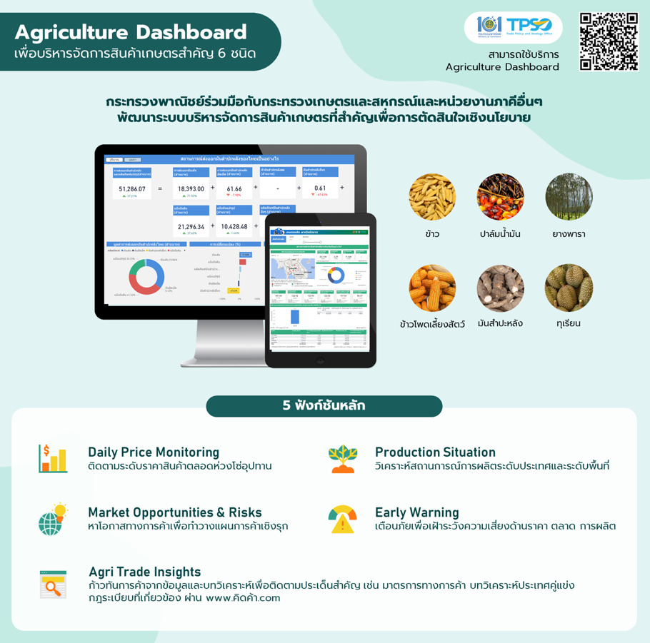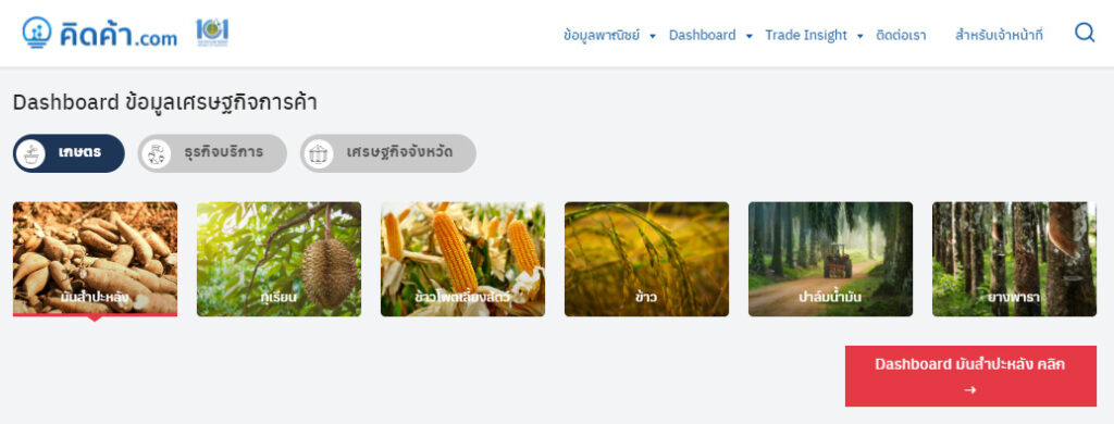 ทั้งนี้ Dashboard สินค้าเกษตรสำคัญดังกล่าว สามารถใช้ติดตามสถานการณ์การค้าสินค้าเกษตรสำคัญในประเด็นสำคัญต่างๆ ทั้งด้านการผลิต ราคา และการส่งออก โดยนำเสนอในรูปแบบ Dashboard ทำให้เห็นภาพ ใช้งานง่าย และแสดงผลการวิเคราะห์หลายมุมมอง สามารถนำไปกำหนดนโยบายเศรษฐกิจการค้าของประเทศและแก้ไขปัญหาทางการค้าได้อย่างทันท่วงที รวมทั้งผู้ประกอบการ เกษตรกร และประชาชน สามารถเข้าใช้บริการข้อมูลการค้าเชิงลึกสำหรับติดตามสถานการณ์การค้า หาโอกาสและเข้าใจความเสี่ยงจากข้อมูลการค้าในหลายมิติ โดย Dashboard ของสินค้าเกษตรสำคัญทั้ง 6 สินค้าดังกล่าว ในส่วนเผยแพร่บนเว็บไซต์ “คิดค้า.com” ได้แก่ 1.ข้อมูลการผลิต เพื่อวิเคราะห์สถานการณ์การผลิตสินค้าเกษตรสำคัญระดับประเทศและระดับพื้นที่ 2.ราคาสินค้าเกษตร เพื่อติดตามราคาสินค้าเกษตรสำคัญตลอดห่วงโซ่อุปทาน 3.การส่งออก เพื่อติดตามสถานการณ์ส่งออกสินค้าเกษตรสำคัญปัจจุบันของไทย และ 4.โอกาสส่งออกและคู่แข่ง เพื่อหาโอกาสทางการค้าของสินค้าเกษตรสำคัญ รวมทั้งมีข้อมูลการเตือนภัย เพื่อเฝ้าระวังความเสี่ยงด้านราคา ตลาด และการผลิต นอกจากนี้ในเว็บไซต์ “คิดค้า.com” มีบทวิเคราะห์ทางการค้าสำหรับผู้ประกอบการหรือผู้ที่สนใจใช้บริการควบคู่กับ Dashboard เพื่อความครอบคลุมทั้งข้อมูลเชิงปริมาณและข้อมูลเชิงคุณภาพ เพื่อติดตามสถานการณ์ทางการค้า วางแผนธุรกิจ แสวงหาโอกาส ป้องกันความเสี่ยง เพิ่มความสามารถทางการแข่งขัน