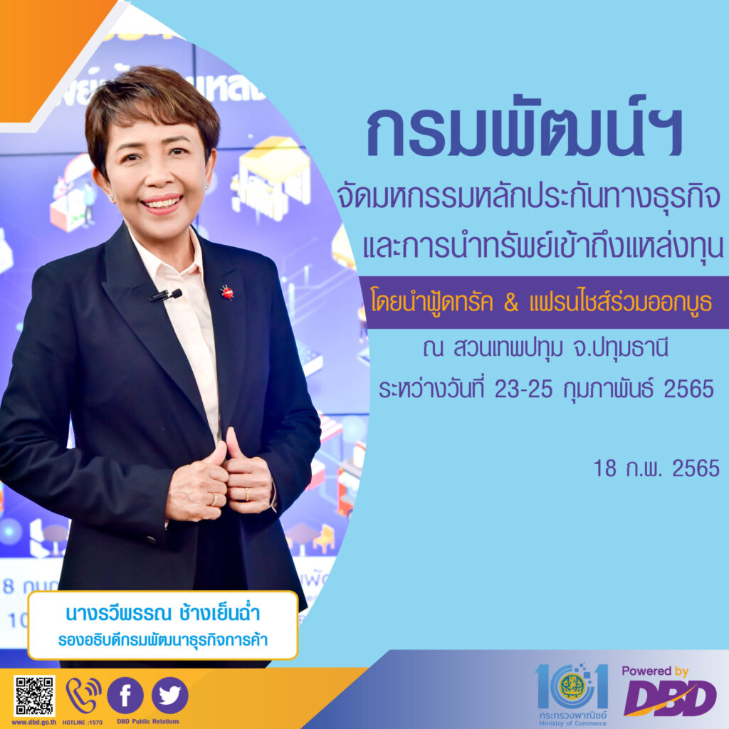 นางรวีพรรณ ช้างเย็นฉ่ำ รองอธิบดีกรมพัฒนาธุรกิจการค้า กระทรวงพาณิชย์ เปิดเผยว่า “ระหว่างวันที่ 23 – 25 กุมภาพันธ์ 2565 กรมพัฒนาธุรกิจการค้าร่วมกับหน่วยงานพันธมิตร จัดงาน ‘มหกรรมหลักประกันทางธุรกิจและการนำทรัพย์เข้าถึงแหล่งทุน’ ณ สวนเทพปทุม จังหวัดปทุมธานี ภายในงานมีผู้ประกอบธุรกิจฟู้ดทรัคและแฟรนไชส์ กว่า 30 ร้านค้า เข้าร่วมจำหน่ายสินค้า/บริการ และเจรจาจับคู่ธุรกิจ รวมทั้ง ได้เชิญสถาบันการเงิน สมาคมนักประเมินราคาอิสระไทย และหน่วยงานพันธมิตรที่เกี่ยวข้อง เข้าร่วมให้คำปรึกษาแนะนำการประกอบธุรกิจ การขอสินเชื่อ และการเข้าถึงแหล่งเงินทุนเพื่อเสริมสภาพคล่อง ต่อยอดธุรกิจ ขยายกิจการ หรือเริ่มต้นเป็นเจ้าของธุรกิจ