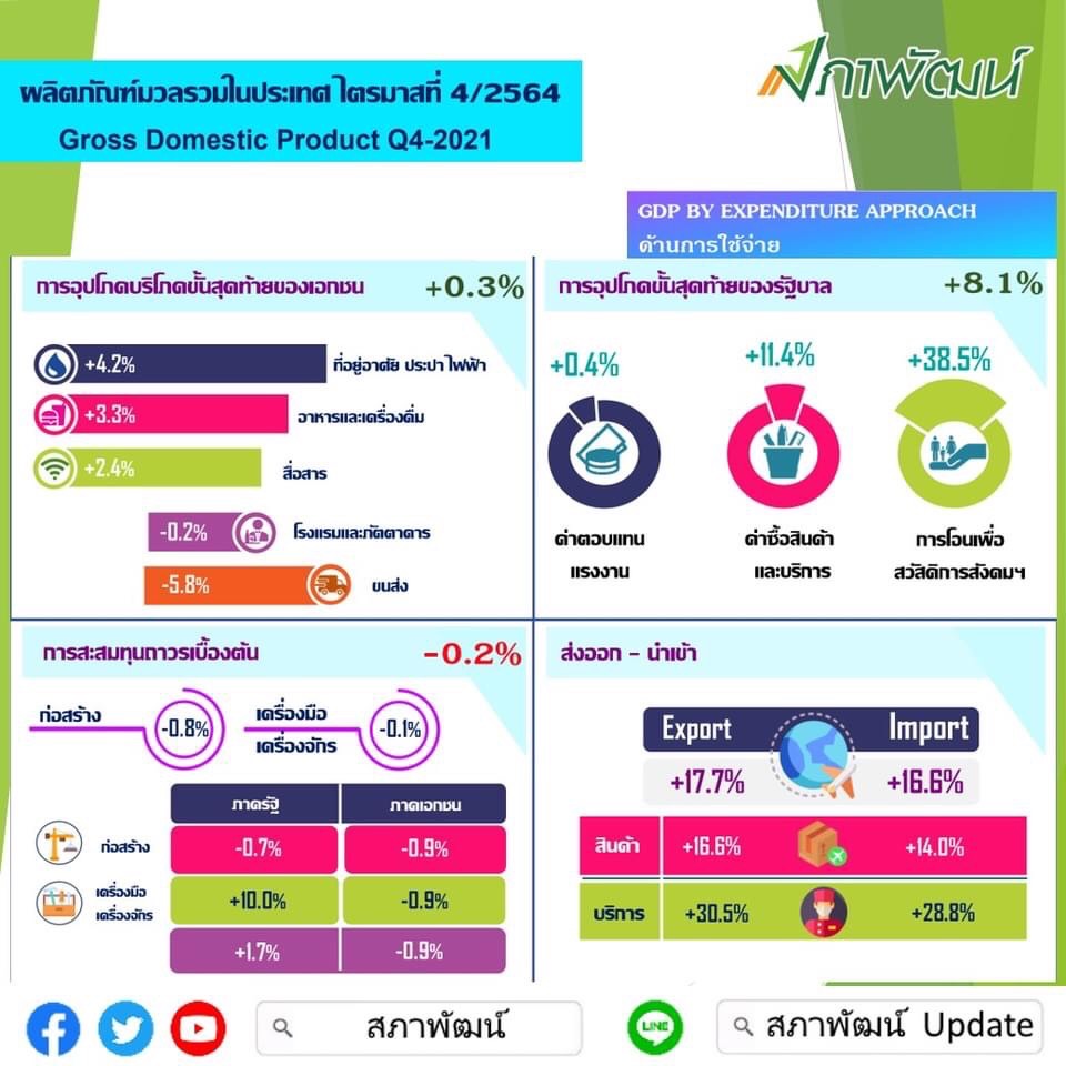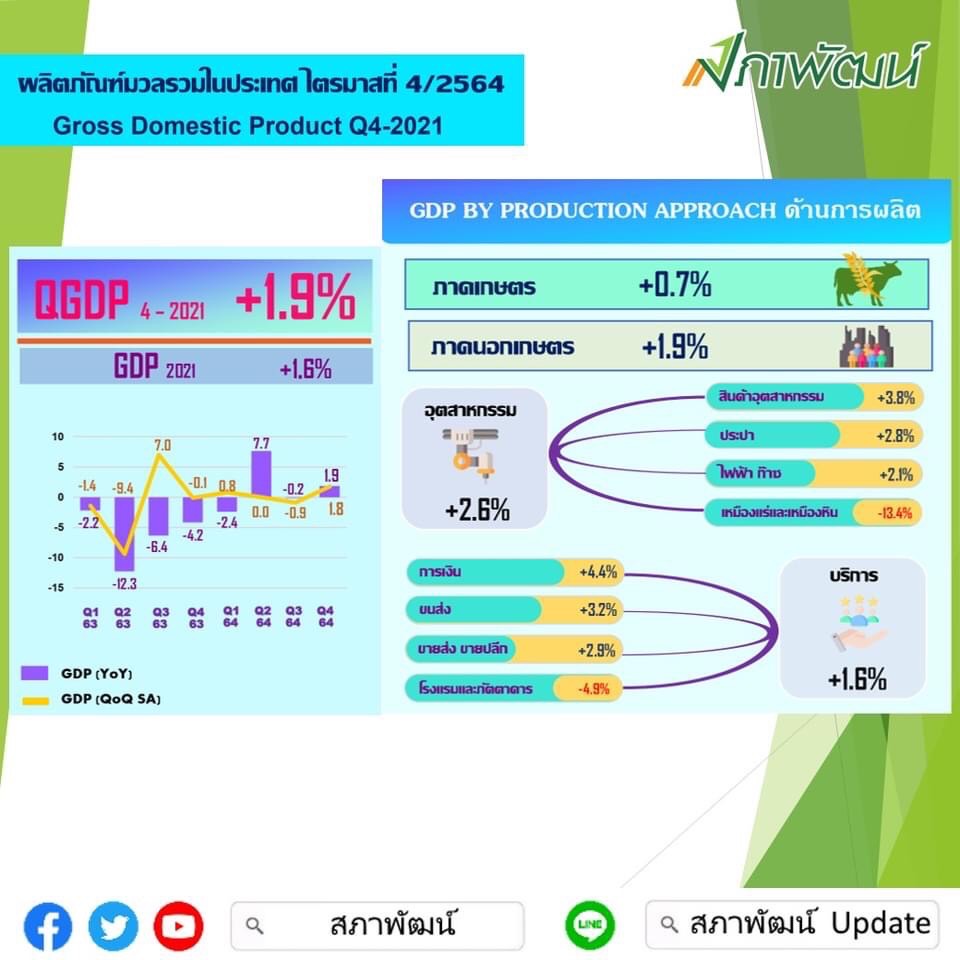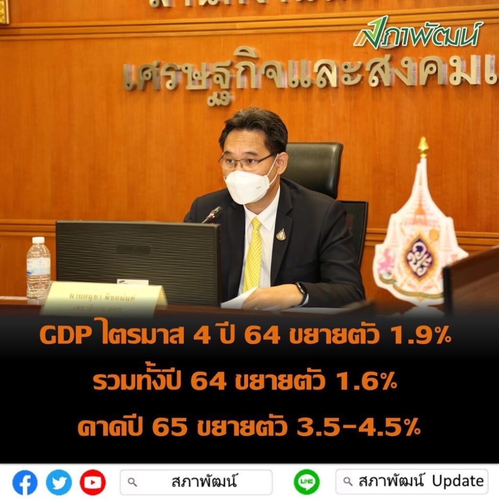 นายดนุชา พิชยนันท์ เลขาธิการสภาพัฒนาการเศรษฐกิจและสังคมแห่งชาติ (สศช.) เปิดเผยตัวเลขผลิตภัณฑ์มวลรวมในประเทศ (จีดีพี) ไตรมาส4 /2564 และแนวโน้มเศรษฐกิจปี 2565 ว่า จีดีพีไตรมาส 4/2564 ขยายตัว 1.9% เมื่อเทียบกับไตรมาสก่อน ในไตรมาสที่สี่ของปี 2564 ขยายตัวร้อยละ 1.9 ปรับตัวดีขึ้นจากการลดลงร้อยละ 0.2 ในไตรมาสก่อนหน้า (%YoY) และเมื่อปรับผลของฤดูกาลออกแล้ว เศรษฐกิจไทยในไตรมาสที่สี่ของปี 2564 ขยายตัวจากไตรมาสที่สามของปี 2564 ร้อยละ 1.8 (%QoQ_SA) รวมทั้งปี 2564 ขยายตัวร้อยละ 1.6 ปรับตัวดีขึ้นจากการลดลงร้อยละ 6.2 ในปี 2563โดยในไตรมาสนี้มีรายรับจากนักท่องเที่ยวชาวไทย 0.084 ล้านล้านบาท ลดลงร้อยละ 47.3 จากไตรมาสเดียวกันของปีก่อน แต่ปรับตัวดีขึ้นเมื่อเทียบกับการลดลงร้อยละ 91.5 ในไตรมาสก่อนหน้า สอดคล้องกับการคลี่คลายลงของสถานการณ์การระบาดของโรคโควิด-19 ในประเทศ การผ่อนคลายมาตรการควบคุมการแพร่ระบาดของภาครัฐ ความคืบหน้าในการกระจายวัคซีน และการดำเนินมาตรการกระตุ้นภาคการท่องเที่ยว นักท่องเที่ยวต่างประเทศที่เดินทางเข้ามาท่องเที่ยวในประเทศไทยมีจำนวน 342,024 คน เพิ่มขึ้นจากฐานต่ำอย่างมีนัยสำคัญ โดยเป็นผลจากการดำเนินนโยบายเปิดประเทศแบบไม่กักตัวและไม่จำกัดพื้นที่ (Test & Go) และการผ่อนคลายมาตรการเดินทางของหลายประเทศ อัตราการเข้าพักเฉลี่ยในไตรมาสนี้อยู่ที่ร้อยละ 26.25 สูงกว่าร้อยละ 5.46 ในไตรมาสก่อนหน้า แต่ต่ำกว่าร้อยละ 32.49 ในไตรมาสเดียวกันของปีก่อน