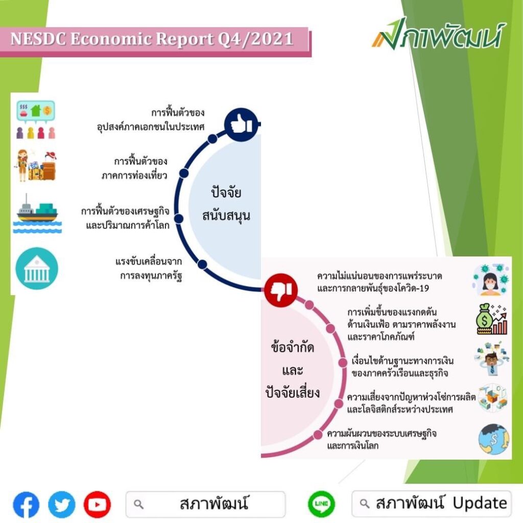 เลขาธิการสภาพัฒนาการเศรษฐกิจและสังคมแห่งชาติ ยังเผยว่า แนวโน้มเศรษฐกิจไทย ปี 2565 คาดว่าจะขยายตัวในช่วงร้อยละ 3.5 – 4.5 โดยมีปัจจัยสนับสนุนสำคัญประกอบด้วย (1) การปรับตัวดีขึ้นของอุปสงค์ภายในประเทศ (2) การฟื้นตัวของภาคการท่องเที่ยว (3) การขยายตัวอย่างต่อเนื่องของการส่งออกสินค้า และ (4) แรงขับเคลื่อนจากการลงทุนภาครัฐ ทั้งนี้ คาดว่ามูลค่าการส่งออกสินค้าในรูปดอลลาร์ สรอ. จะขยายตัวร้อยละ 4.9 การอุปโภคบริโภคและการลงทุนภาคเอกชนขยายตัวร้อยละ 4.5 และร้อยละ 3.8 ตามลำดับ ส่วนการลงทุนภาครัฐคาดว่าจะขยายตัวร้อยละ 4.6 อัตราเงินเฟ้อทั่วไปเฉลี่ยอยู่ในช่วงร้อยละ 1.5 – 2.5 และดุลบัญชีเดินสะพัดจะเกินดุลร้อยละ 1.5 ของ GDP