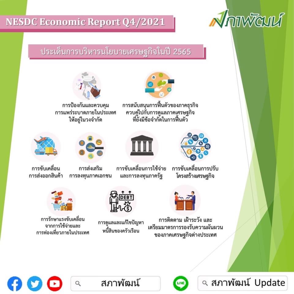 ส่วนประเด็นการบริหารเศรษฐกิจในปี 2565 โดยการบริหารนโยบายเศรษฐกิจในปี 2565 ควรให้ความสำคัญกับ (1) การป้องกันและควบคุมการแพร่ระบาดภายในประเทศให้อยู่ในวงจำกัด (2) การสนับสนุนการฟื้นตัวของภาคธุรกิจ ควบคู่ไปกับการดูแลภาคเศรษฐกิจที่ยังมีข้อจำกัดในการฟื้นตัว(3) การรักษาแรงขับเคลื่อนจากการใช้จ่ายภายในประเทศ (4) การดูแลและแก้ไขปัญหาหนี้สินของครัวเรือน โดยให้ความสำคัญกับมาตรการปรับปรุงโครงสร้างหนี้ให้แก่ลูกหนี้ที่ได้รับผลกระทบ ควบคู่ไปกับการดำเนินมาตรการจูงใจในการชำระหนี้และบรรเทาภาระหนี้สินที่สำคัญ (5) การขับเคลื่อนการส่งออกสินค้า (6) การส่งเสริมการลงทุนภาคเอกชน(7) การขับเคลื่อนการใช้จ่ายและการลงทุนภาครัฐ (8) การติดตาม เฝ้าระวัง และเตรียมมาตรการรองรับความผันผวนของภาคเศรษฐกิจต่างประเทศ และ (9) การขับเคลื่อนการปรับโครงสร้างเศรษฐกิจเพื่อเพิ่มขีดความสามารถในการแข่งขัน สนับสนุนการกระจายรายได้ และปรับตัวเข้าสู่สังคมคาร์บอนต่ำ.-สำนักข่าวไทย