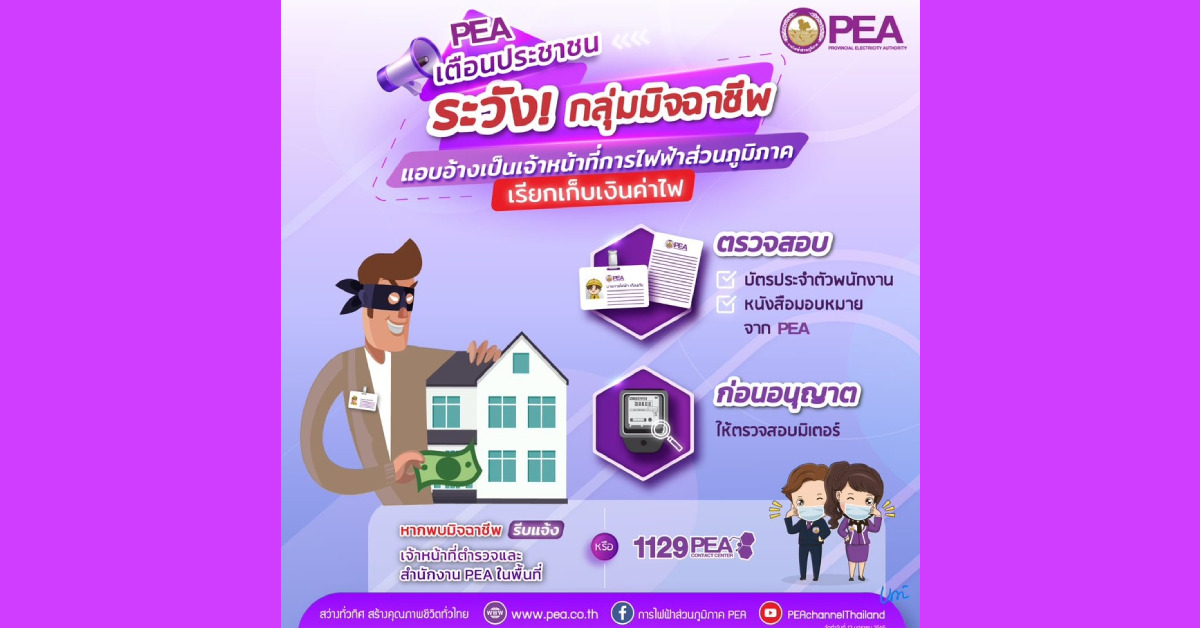 การไฟฟ้าส่วนภูมิภาค (PEA) ขอแจ้งเตือนประชาชนให้ระมัดระวังกลุ่มมิจฉาชีพ ที่แอบอ้างเป็นเจ้าหน้าที่ของการไฟฟ้าส่วนภูมิภาค ดำเนินการเรียกเก็บเงินค่าไฟฟ้าและเตือนอย่าหลงเชื่อกลุ่มมิจฉาชีพดังกล่าว พร้อมแนะนำให้ประชาชนเรียกตรวจสอบบัตรประจำตัวพนักงานของการไฟฟ้าส่วนภูมิภาค และหนังสือมอบหมายจากการไฟฟ้าส่วนภูมิภาค ก่อนอนุญาตให้เข้าตรวจสอบมิเตอร์ไฟฟ้าทุกครั้ง