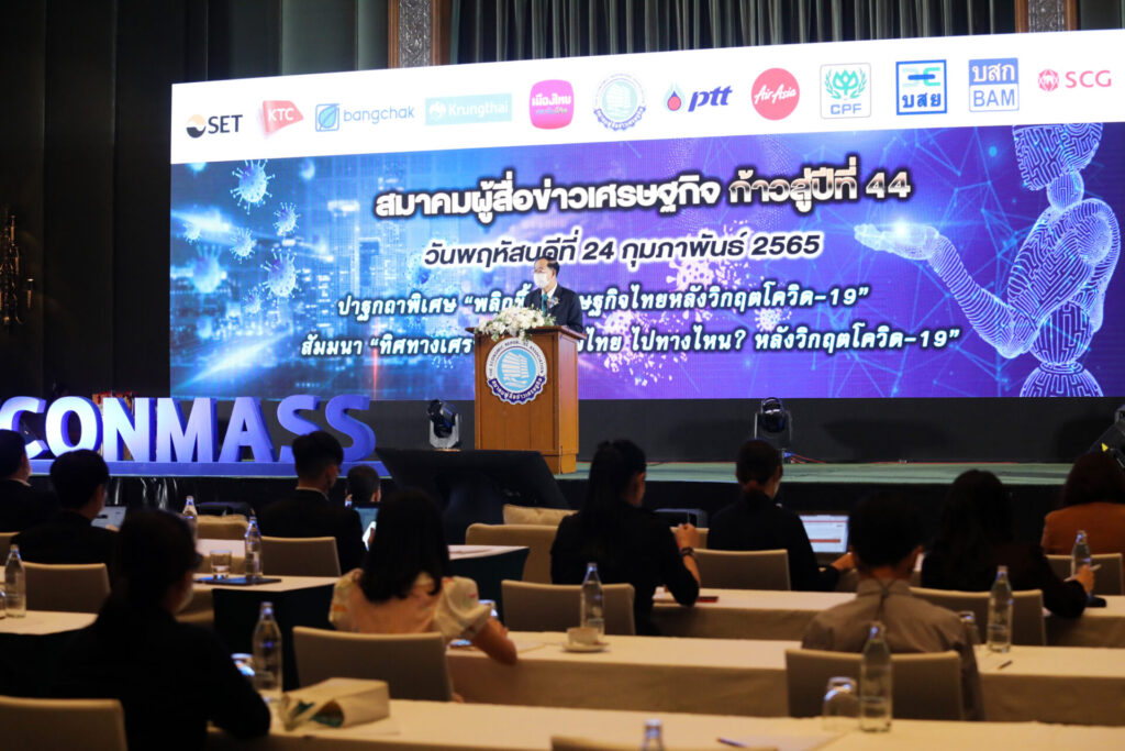 นายอาคม เติมพิทยาไพสิฐ รัฐมนตรีว่าการกระทรวงการคลังปาฐกถาพิเศษในงานสัมมนาสมาคมผู้สื่อข่าวเศรษฐกิจก้าวสู่ปีที่ 44 เรื่อง “พลิกฟื้นเศรษฐกิจไทย หลังวิกฤติโควิด-19” โดยกล่าวว่า ผลกระทบจากโควิด-19 ต้องได้รับความร่วมมือจากทุกฝ่าย แม้ว่ารัฐบาลพยายามเปิดประเทศ ด้วยระบบ Test & Go ยังมีนักท่องเที่ยวต่างชาติต้องการเข้าไทยกว่า 3 แสนคน นับว่ามีความต้องการสูง ที่ต้องการเดินทางเข้าไทย จึงเป็นแรงส่งสร้างรายได้ให้กับประเทศ เมื่อจีดีพีไทยปี 64 ร้อยละ 1.6 และจะทำให้จีดีพีปี 65 ขยายตัวฟื้นตัวต่อเนื่อง เมื่อการส่งออกขยายตัวร้อยละ 17 หลายประเทศทั่วโลกเศรษฐกิจเร่ิมฟื้นตัว จึงมีออเดอร์สั่งซื้อสินค้า แต่ยอมรับว่าไตรมาส 1 ปี 65 จีดีพีของหลายประเทศเศรษฐกิจแผ่วลง รวมทั้งไทย