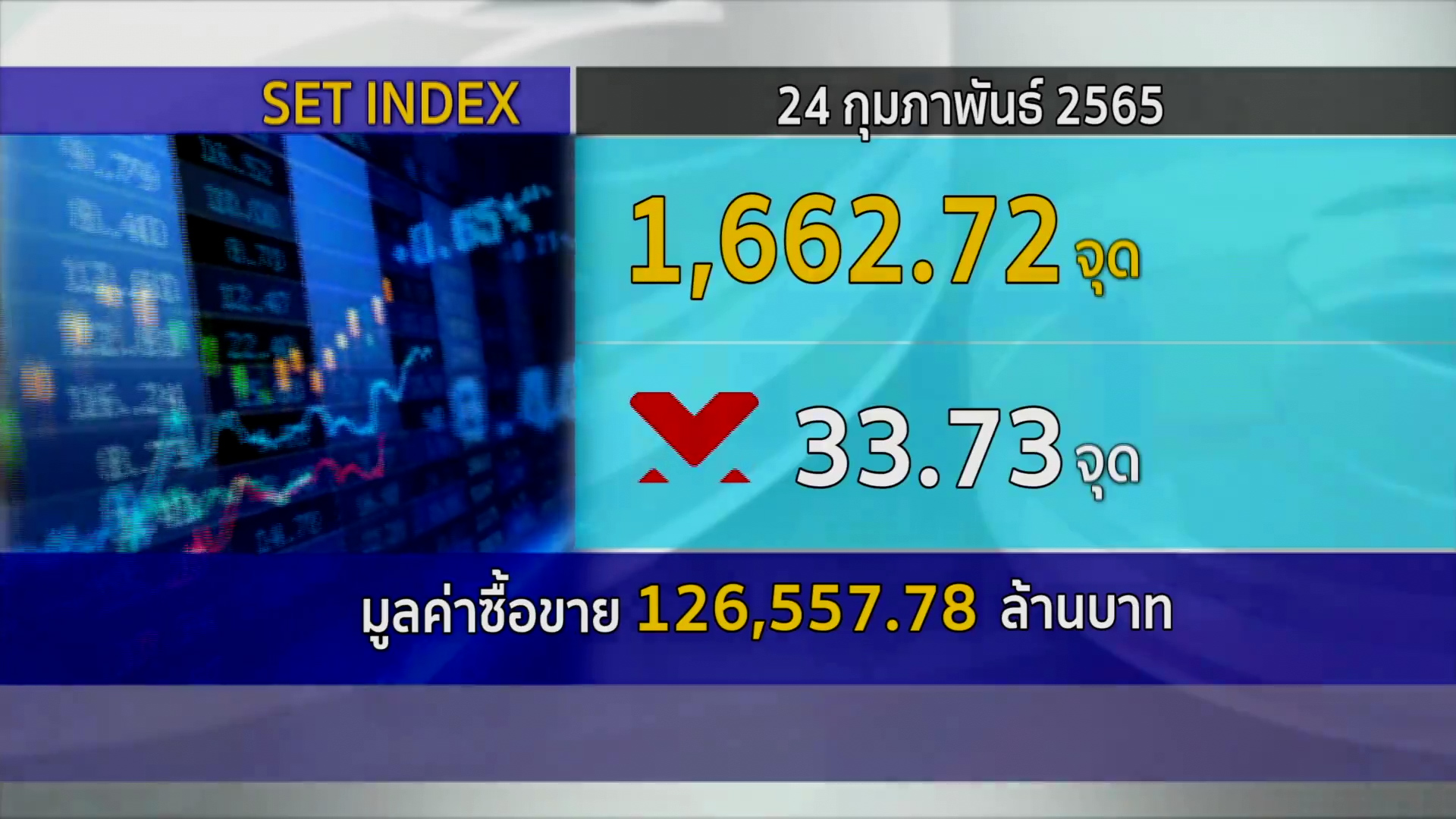 กทม. 24 ก.พ.- ตลาดหลักทรัพย์ ปิดวันนี้ที่ระดับ 1,662.72 จุด ลดลง 33.73 จุด (-1.99%) มูลค่าการซื้อขาย 126,557.78 ล้านบาท ร่วงแรงตามตลาดทั่วโลกหลังจากรัสเซียเปิดฉากโจมตียูเครน