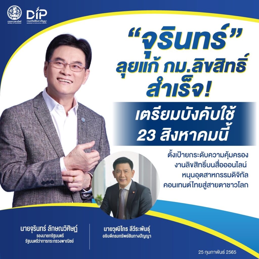 นายจุรินทร์ ลักษณวิศิษฏ์ รองนายกรัฐมนตรีและรัฐมนตรีว่าการกระทรวงพาณิชย์ ผลักดันกฎหมายลิขสิทธิ์ฉบับใหม่สำเร็จ ซึ่งจะมีผลบังคับใช้วันที่ 23 สิงหาคมนี้ คาดช่วยระงับการละเมิดลิขสิทธิ์บนอินเทอร์เน็ต ได้อย่างทันท่วงที รองรับนโยบายซอฟต์พาวเวอร์ของรัฐบาล และการเติบโตของอุตสาหกรรมดิจิทัลคอนเทนต์ไทยสู่ระดับโลก
