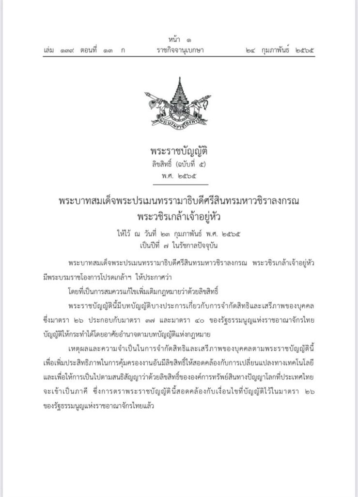 “นอกจากมาตรการป้องปรามการละเมิดลิขสิทธิ์บนสื่อออนไลน์แล้ว กฎหมายดังกล่าวยังมีการขยายอายุความคุ้มครองงานภาพถ่ายไปตลอดชีวิตของผู้สร้างสรรค์และคุ้มครองต่อไปอีก 50 ปี หลังจากผู้สร้างสรรค์เสียชีวิต เพื่อรองรับการเข้าเป็นภาคีสนธิสัญญาว่าด้วยลิขสิทธิ์ขององค์การทรัพย์สินทางปัญญาโลก (WIPO Copyright Treaty: WCT) ซึ่งศิลปินไทยผู้สร้างสรรค์จะได้ประโยชน์จากเรื่องดังกล่าวด้วยเช่นกัน โดยความคืบหน้าล่าสุด กฎหมายดังกล่าวได้ประกาศในราชกิจจานุเบกษาแล้ว ซึ่งจะมีผลบังคับใช้อย่างเป็นทางการในวันที่ 23 สิงหาคม 2565 ระหว่างนี้กรมทรัพย์สินทางปัญญาจะเดินหน้าเตรียมความพร้อมสำหรับการออกประกาศกระทรวงพาณิชย์ที่เกี่ยวข้อง เพื่อรองรับการบังคับใช้กฎหมายดังกล่าว และเตรียมยื่นภาคยานุวัติสารสำหรับการเข้าเป็นภาคี WCT ของประเทศไทยต่อไป ทั้งนี้ กรมฯ ขอขอบคุณหน่วยงานทั้งภาครัฐและเอกชน ตลอดจนผู้มีส่วนเกี่ยวข้องทุกภาคส่วนที่เล็งเห็นความสำคัญและร่วมผลักดัน พ.ร.บ. ลิขสิทธิ์ ฉบับนี้ให้สำเร็จลุล่วงไปด้วยดี” นายวุฒิไกร กล่าว.-สำนักข่าวไทย