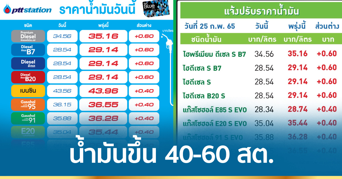 PTT Station ปรับราคาขายปลีกน้ำมันกลุ่มเบนซินและแก๊สโซฮอล์ทุกชนิดขึ้น 0.40 บาทต่อลิตร ส่วนกลุ่มดีเซลทุกชนิด ปรับขึ้น 0.60 บาทต่อลิตร มีผล 26 ก.พ.65 เวลา 05.00 น. เป็นต้นไป โดยราคาขายปลีก จะเป็นดังนี้ ULG = 43.96, GSH95 = 36.55, E20 = 35.44, GSH91 = 36.28, E85 = 28.74, HSD- B7= 29.14, HSD-B10 = 29.14, HSD-B20=29.14, ดีเซลพรีเมี่ยม B7 = 35.16 บาทต่อลิตร โดยราคาขายปลีกข้างต้นยังไม่รวมภาษีบำรุงกรุงเทพมหานคร