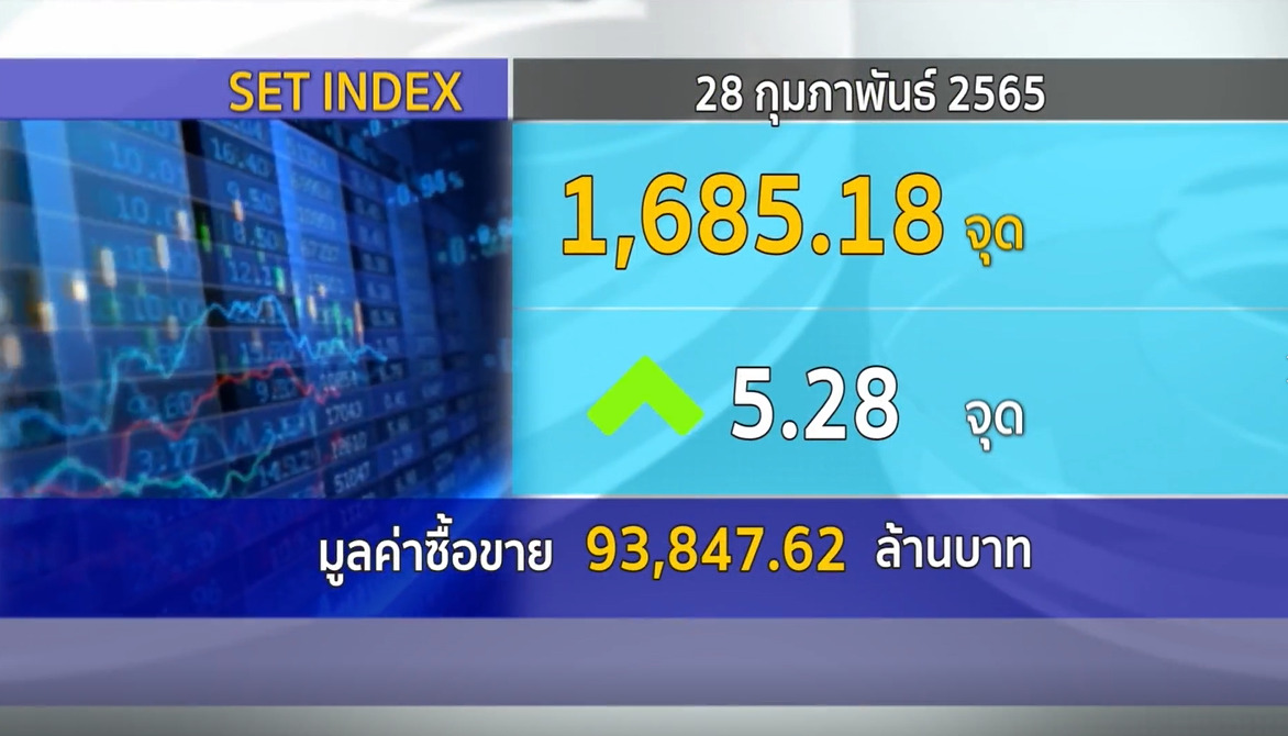 กทม. 28 ก.พ.-ตลาดหลักทรัพย์ ปิดวันนี้ที่ระดับ 1,685.18 จุด เพิ่มขึ้น 5.28 จุด (+0.31%) มูลค่าการซื้อขาย 93,847.62 ล้านบาท หุ้นไทยวันนี้ผันผวน กังวลสถานการณ์สงครามรัสเซียและยูเครนยืดเยื้อ แต่ตลาดทุนเอเชียฟื้นตัว เพราะได้รับผลกระทบน้อยกว่ายุโรป
