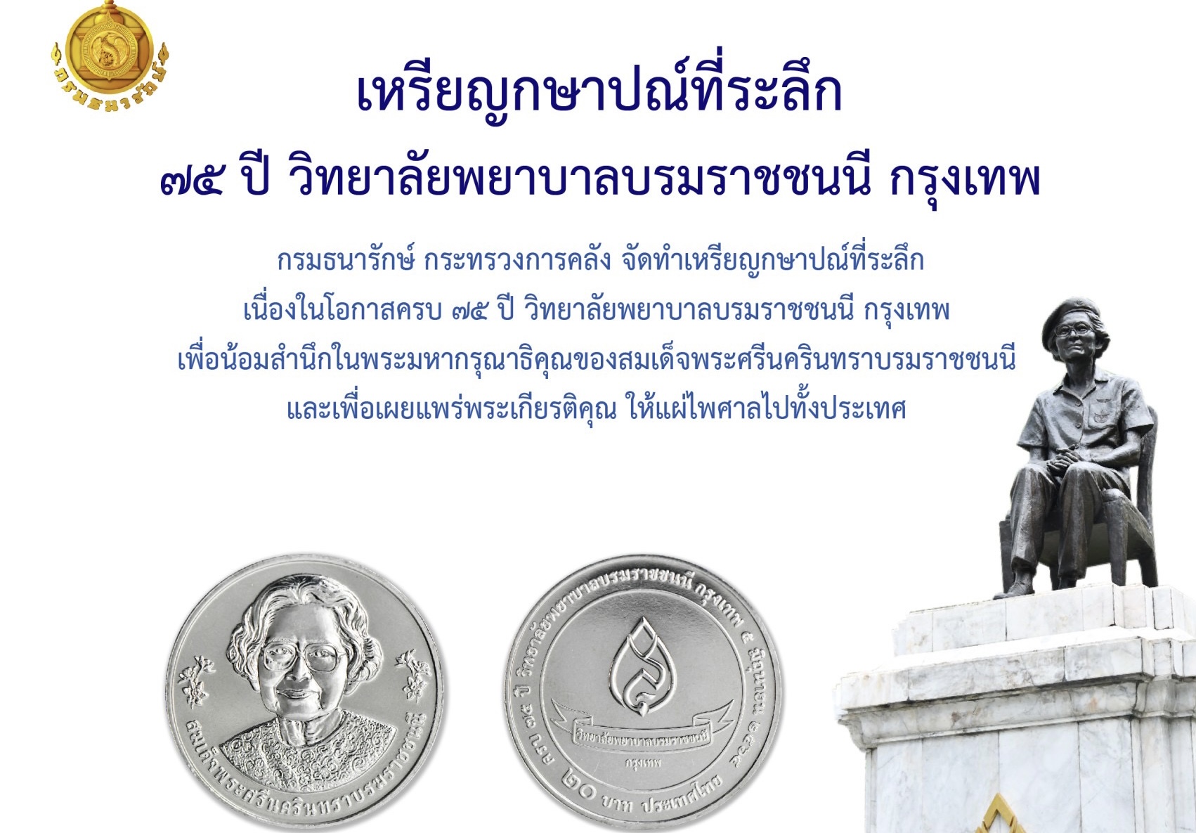 กระทรวงการคลังได้อนุมัติให้กรมธนารักษ์จัดทำเหรียญกษาปณ์ที่ระลึกเนื่องในโอกาสครบ 75 ปี วิทยาลัยพยาบาลบรมราชชนนี กรุงเทพ เพื่อเป็นที่ระลึกและน้อมสำนึกในพระมหากรุณาธิคุณของสมเด็จพระศรีนครินทราบรมราชชนนี และเพื่อเผยแพร่พระเกียรติคุณของพระองค์ท่าน ให้แผ่ไพศาลไปทั้งภายในประเทศและนานาประเทศ โดยจัดทำเป็นเหรียญกษาปณ์โลหะสีขาว (ทองแดงผสมนิกเกิล) ชนิดราคา 20 บาท ประเภทธรรมดา ซึ่งมีลวดลาย