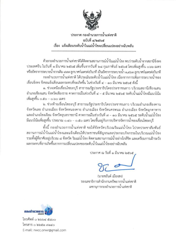 กรุงเทพฯ 2 มี.ค. – สทนช. เตรียมส่งหนังสือถึงทางการจีนเป็นครั้งที่ 2 เพื่อขอความร่วมมือแจ้งเตือนก่อนปล่อยน้ำจากเขื่อนในแม่น้ำโขง ซึ่งจะทำให้ 8 จังหวัดริมแม่น้ำโขงของไทยมีเวลาเตรียมพร้อมรับสถานการณ์ที่ระดับน้ำจะสูงขึ้น ดังล่าสุดที่จีนระบายน้ำเพิ่มจากเขื่อนจิ่งหงเมื่อวันที่ 28 ก.พ. ซึ่งระดับน้ำจะสูงขึ้นฉับพลันกว่า 60 ซม. แต่ไม่แจ้งมายังไทย ซึ่งกองอำนวยการน้ำแห่งชาติออกประกาศเตือนทางจังหวัดและประชาชนแล้ว