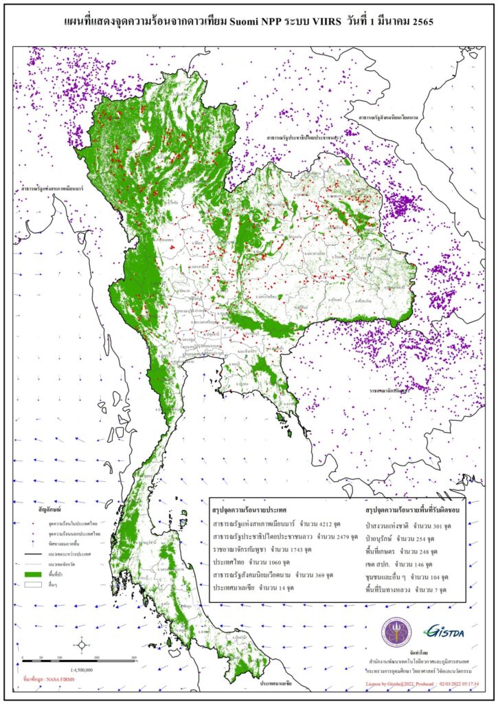 สำนักงานพัฒนาเทคโนโลยีอวกาศและภูมิสารสนเทศ (องค์การมหาชน) หรือ GISTDA เผยข้อมูลจากดาวเทียมซูโอมิ เอ็นพีพี (Suomi NPP) ของระบบเวียร์ (VIIRS) วันที่ 1 มีนาคม 2565 พบจุดความร้อนทั้งประเทศ 1,060 จุด เพิ่มขึ้นจากวานก่อน 318 จุด พบมากที่สุดในพื้นที่ป่าสงวนแห่งชาติ 301 จุด พื้นที่ป่าอนุรักษ์ 254 จุด พื้นที่เกษตร 248 จุด พื้นที่เขตสปก. 146 จุด พื้นที่ชุมชนและอื่นๆ 104 จุด และพื้นที่ริมทางหลวง 7 จุด