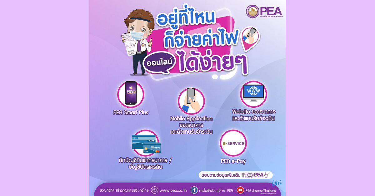 กรุงเทพฯ 2 มี.ค.- PEA ห่วงใยผู้ใช้ไฟฟ้าในสถานการณ์แพร่ระบาดเชื้อโควิด-19 แนะผู้ใช้ไฟฟ้าชำระค่าไฟฟ้าผ่านทางช่องทางออนไลน์ เพื่อลดและป้องกันการติดเชื้อโควิด-19 สามารถสอบถามข้อมูลเพิ่มเติมได้ที่ 1129 PEA Contact Center ตลอด 24 ชั่วโมง