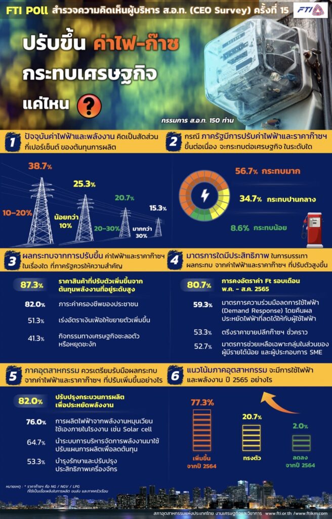 นายวิรัตน์ เอื้อนฤมิต รองประธานสภาอุตสาหกรรมแห่งประเทศไทย (ส.อ.ท.) เปิดเผยผลการสำรวจ FTI Poll ภายใต้หัวข้อ “ปรับขึ้นค่าไฟ-ก๊าซ กระทบเศรษฐกิจแค่ไหน” พบว่า ผู้บริหาร ส.อ.ท. มองว่า กรณีภาครัฐจะมีการพิจารณาปรับอัตราค่าไฟฟ้าและราคาก๊าซได้แก่ NG / NGV / LPG ที่ใช้เป็นเชื้อเพลิงในการผลิต ขนส่ง และภาคครัวเรือนขึ้นต่อเนื่องนั้น จะส่งผลกระทบอย่างมากต่อการฟื้นตัวของเศรษฐกิจไทย และยังเป็นการซ้ำเติมปัญหาให้แก่ผู้ประกอบการที่ต้องแบกรับภาระต้นทุนการผลิตที่อยู่ในระดับสูงในขณะนี้ จนทำให้ผู้ประกอบการมีความจำเป็นจะต้องปรับราคาสินค้าขึ้นตามต้นทุนที่เพิ่มขึ้น ซึ่งจะกระทบต่อภาระค่าครองชีพของประชาชน ดังนั้น จึงเสนอขอให้ภาครัฐพิจารณาคงอัตราค่าไฟฟ้าผันแปร (Ft) ในรอบเดือนพฤษภาคม – สิงหาคม 2565 เพื่อช่วยบรรเทาผลกระทบดังกล่าว นอกจากนี้ ผู้บริหาร ส.อ.ท. ยังได้แนะให้ภาคอุตสาหกรรมเร่งปรับปรุงกระบวนการผลิตเพื่อประหยัดพลังงาน และหันมาผลิตไฟฟ้าจากพลังงานหมุนเวียนใช้เองภายในโรงงานอุตสาหกรรม