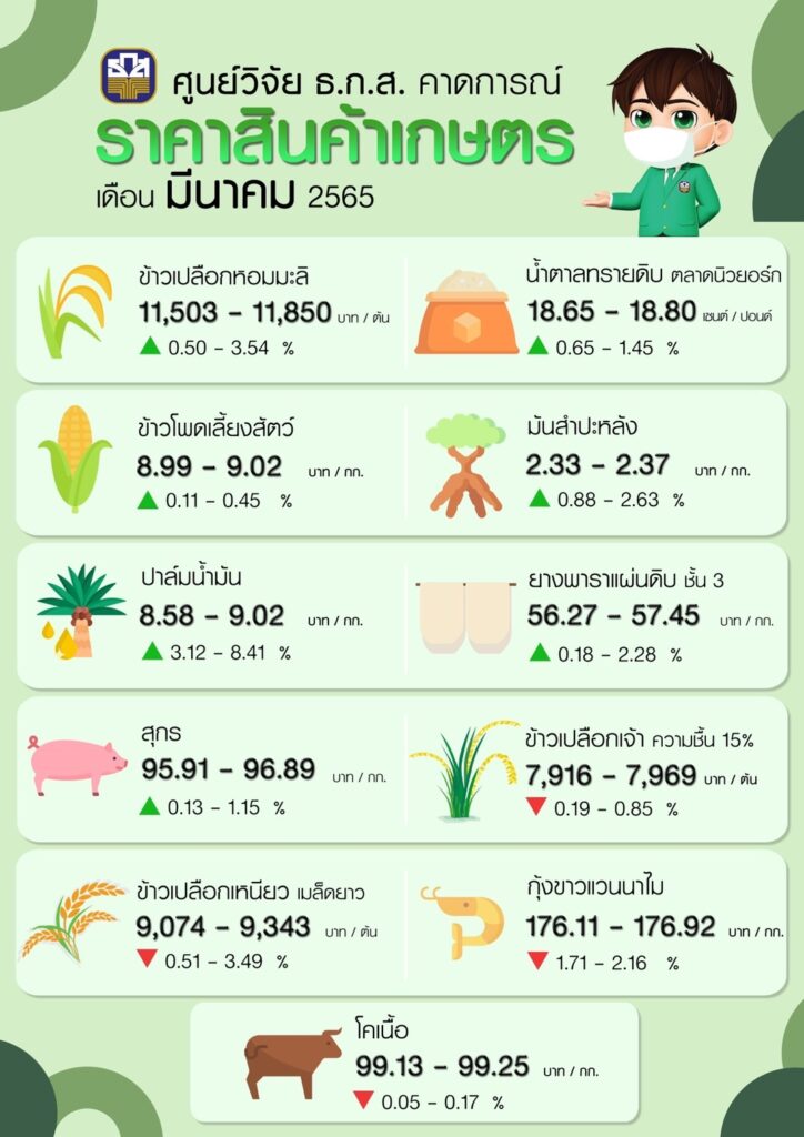 ศูนย์วิจัยและพัฒนานวัตกรรม ธ.ก.ส. คาดความขัดแย้งระหว่างรัสเซียและยูเครนและมาตรการสนับสนุนของรัฐบาล รวมถึงมาตรการควบคุมการป้องกันการระบาดของโควิด-19 ทำให้ในเดือนมีนาคม 2565 ราคาสินค้าเกษตรส่วนใหญ่ ได้แก่ ข้าวเปลือกเจ้าหอมมะลิ น้ำตาลทรายดิบ มันสำปะหลัง ข้าวโพดเลี้ยงสัตว์ ปาล์มน้ำมัน และยางพาราดิบชั้น 3 และสุกร มีแนวโน้มราคาเพิ่มขึ้น ด้านข้าวเปลือกเจ้า ข้าวเปลือกเหนียว กุ้งขาวแวนนาไม และโคเนื้อมีแนวโน้มราคาปรับลดลง