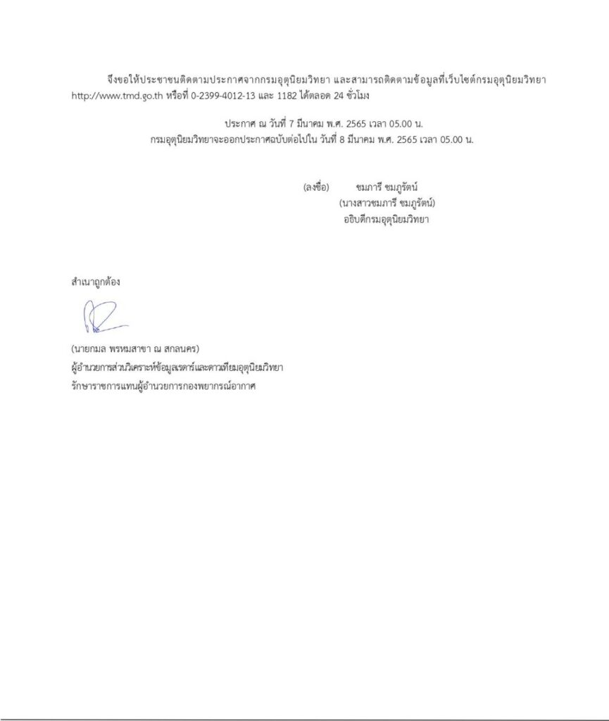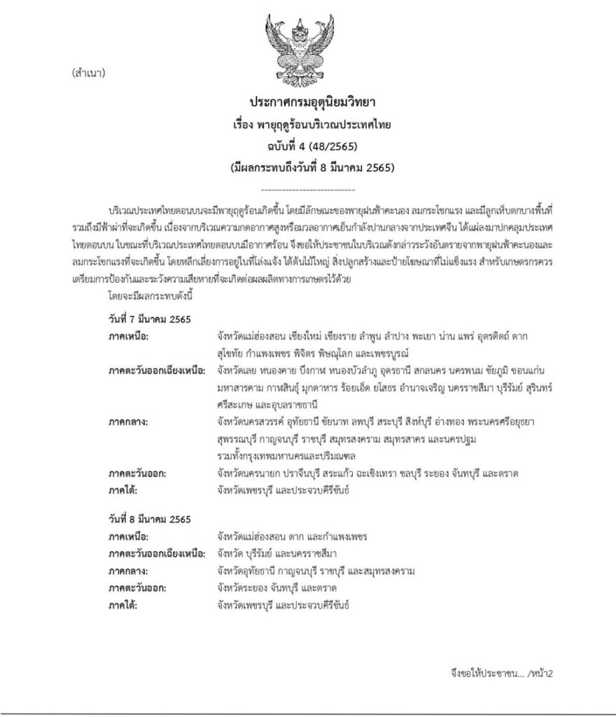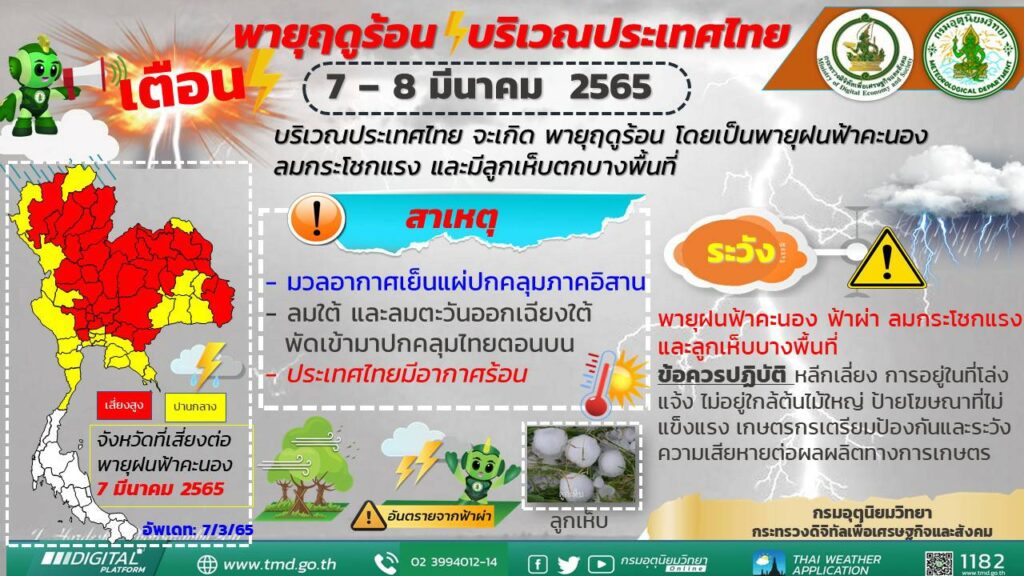 กรมอุตุนิยมวิทยาออกประกาศเตือนเฝ้าระวังพายุฤดูร้อนฉบับที่ 4 โดยจะมีผลกระทบต่อเนื่องถึงวันพรุ่งนี้ ( 8 มี.ค.) เนื่องจากบริเวณประเทศไทยตอนบนจะมีพายุฤดูร้อนเกิดขึ้น โดยมีลักษณะของพายุฝนฟ้าคะนอง ลมกระโชกแรง และมีลูกเห็บตกบางพื้นที่ รวมถึงมีฟ้าผ่าที่จะเกิดขึ้น เนื่องจากบริเวณความกดอากาศสูงหรือมวลอากาศเย็นกำลังปานกลางจากประเทศจีน ได้แผ่ลงมาปกคลุมประเทศไทยตอนบน ในขณะที่บริเวณประเทศไทยตอนบนมีอากาศร้อน จึงขอให้ประชาชนในบริเวณดังกล่าวระวังอันตรายจากพายุฝนฟ้าคะนองและลมกระโชกแรงที่จะเกิดขึ้น โดยหลีกเสี่ยงการอยู่ในที่โล่งแจ้ง ใต้ตันไม้ใหญ่ สิ่งปลูกสร้างและป้ายโฆษณาที่ไม่แข็งแรง สำหรับเกษตรกรควรเตรียมการป้องกันและระวังความเสียหายที่จะเกิดต่อผลผลิตทางการเกษตรไว้ด้วย