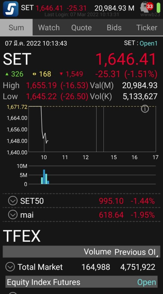 ด้านตลาดหุ้นไทย (SET)เปิดภาคเช้าร่วงลงไปกว่า 19 จุด ตามทิศทางตลาดเอเชีย ตลาดผลกระทบสถานการณ์ระหว่างรัสเซีย-ยูเครน และกังวลราคาน้ำมันพุ่งสูงต่อเนื่องจากผลกระทบสถานการณ์ระหว่างรัสเซีย-ยูเครนยืดเยื้อ ส่งผลให้เงินเฟ้อปรับตัวสูงขึ้นไปด้วยอาจกดดันต่อการฟื้นตัวของเศรษฐกิจโลก ราคาน้ำมันดิบระหว่างวันซื้อขาย วันนี้ WTI และ BRENT เกือบ 130 เหรียญสหรัฐ/บาร์เรล และราคาสินค้าโภคภัณฑ์ต่างๆขยับขึ้น