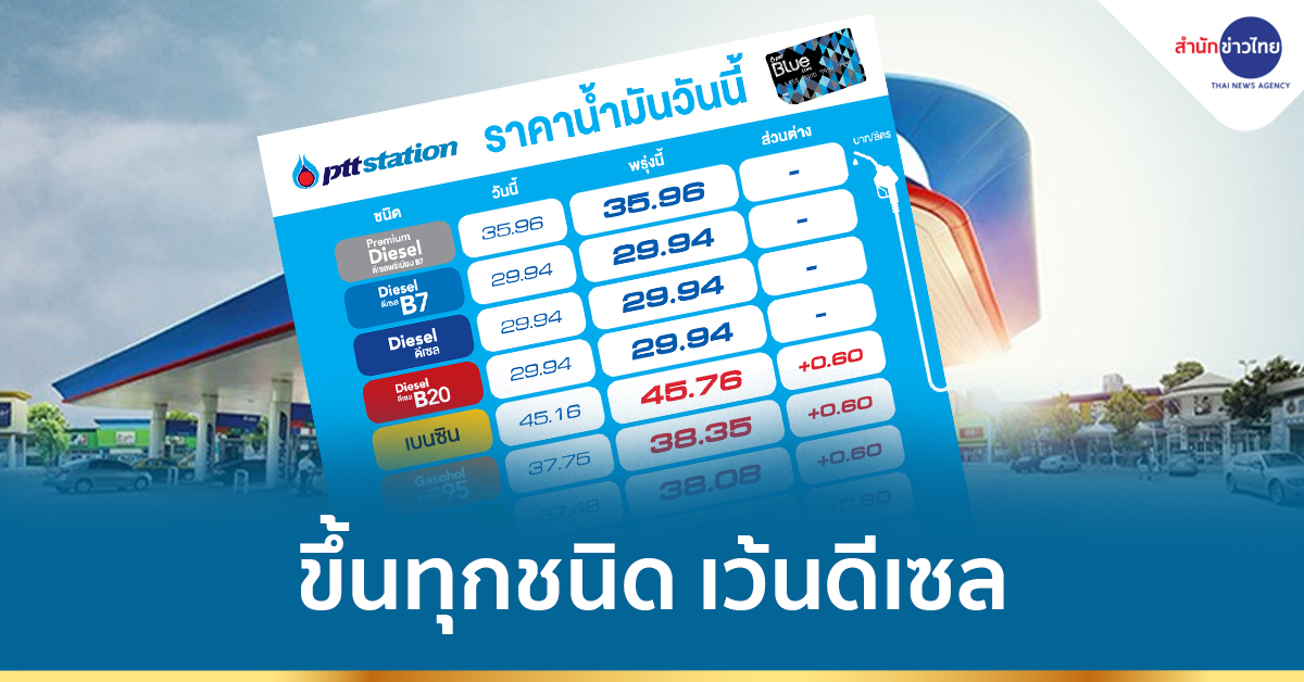 โดยราคาขายปลีกจะเป็นดังนี้ ULG = 45.76, GSH95 = 38.35, E20 = 37.24, GSH91 = 38.08, E85 = 29.94, HSD- B7= 29.94, HSD-B10 = 29.94, HSD-B20=30.54,ดีเซลพรีเมี่ยม B7 = 35.96 บาทต่อลิตร โดยราคาขายปลีกข้างต้นยังไม่รวมภาษีบำรุงกรุงเทพมหานคร .-สำนักข่าวไทย