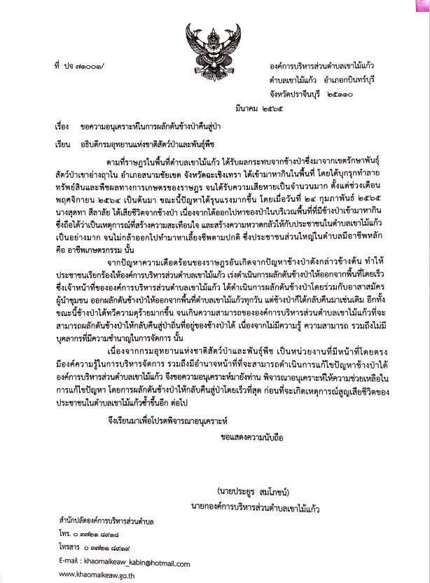 ปราจีนบุรี 9 มี.ค.-นายก อบต. เขาไม้แก้ว จ. ปราจีนบุรี ยื่นหนังสือถึงกรมอุทยานฯ ให้เร่งย้าย “สีดอโหนก” ช้างป่าจากเขตรักษาพันธุ์สัตว์ป่าเขาอ่างฤาไน ออกจากชุมชนเขาไม้แก้ว เนื่องจากชาวบ้านหวาดผวาจนไม่กล้าออกไปเก็บเกี่ยวผลผลิต เหตุ “สีดอโหนก” เพิ่งทำร้ายชาวบ้านจนเสียชีวิต