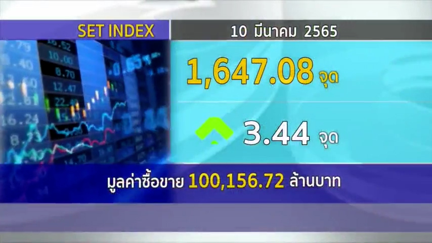 SET ปิดวันนี้ที่ระดับ 1,647.08 จุด เพิ่มขึ้น 3.44 จุด (+0.21%) มูลค่าการซื้อขาย 100,156.72 ล้านบาท นักวิเคราะห์ฯเผยดัชนีตลาดหุ้นไทยวันนี้แกว่งตัวอิงแดนบวกตามตลาดภูมิภาค จากความหวังสงครามรัสเซีย-ยูเครนยุติ แต่มีแรงขายทำกำไรสลับออกมาจากความไม่แน่นอนของการเจรจาที่ยังกดดัน แนวโน้มพรุ่งนี้คาดแกว่งไซด์เวย์ ให้แนวรับ 1,630-1,640 จุด แนวต่านที่ 1,660 จุด .-สำนักข่าวไทย