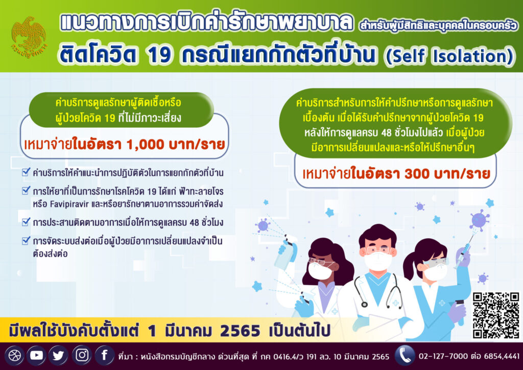 “การเบิกจ่ายค่ารักษาพยาบาลสำหรับผู้มีสิทธิและบุคคลในครอบครัวที่ติดเชื้อโควิด 19 โดยให้บริการในลักษณะผู้ป่วยนอกและให้ผู้ป่วยแยกกักตัวที่บ้าน (Self Isolation) ให้สถานพยาบาลของทางราชการเบิกค่ารักษาพยาบาลในระบบเบิกจ่ายตรงเท่านั้น ให้มีผลใช้บังคับตั้งแต่วันที่ 1 มีนาคม 2565 เป็นต้นไป สอบถามเพิ่มเติมได้ที่กองสวัสดิการรักษาพยาบาล กรมบัญชีกลาง หมายเลขโทรศัพท์ 02 127 7000 ต่อ 6854 4441 ในวัน เวลาราชการ” อธิบดีกรมบัญชีกลาง กล่าว.-สำนักข่าวไทย