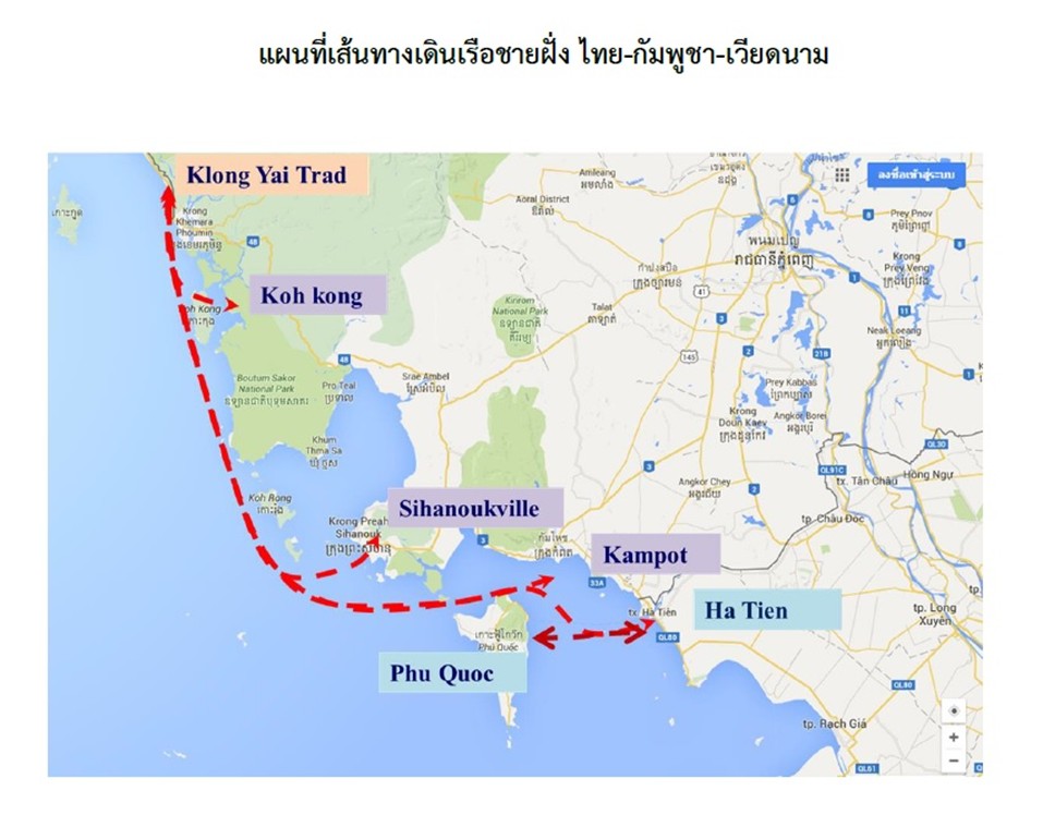 โดยฝ่ายเวียดนามขอให้มีการขยายเส้นทางการเดินเรือจากเกาะฟูก๊วก (เวียดนาม) มาถึงกรุงเทพมหานคร ซึ่งการส่งเสริมการเดินเรือชายฝั่งดังกล่าว เป็นความเห็นชอบของนายกรัฐมนตรีไทยและเวียดนาม ตั้งแต่ปี 2557 ต่อมาไทย กัมพูชา และเวียดนาม ได้จัดตั้งคณะทำงานร่วมสามฝ่าย เพื่อศึกษาความเป็นไปได้และความเหมาะสมของการเดินเรือชายฝั่ง โดยระยะแรกการเดินเรือขนส่งชายฝั่งจะเข้าเทียบท่าเฉพาะท่าเรือขนาดกลางและขนาดเล็กที่ตั้งอยู่ระหว่างภาคตะวันออกของไทย ภาคใต้ของกัมพูชา และภาคใต้ของเวียดนาม เพื่อเปิดโอกาสให้เรือขนาดเล็กสามารถขยายเส้นทางการค้าไปยังประเทศเพื่อนบ้านได้ ซึ่งการดำเนินการดังกล่าวจะช่วยพัฒนามิติการการลงทุนของทั้ง 3 ประเทศ ไทย กัมพูชา และเวียดนาม ซึ่งทางฝ่ายไทยพร้อมที่จะร่วมผลักดันให้เกิดการพัฒนาเส้นทางการเดินเรืออย่างเป็นรูปธรรม