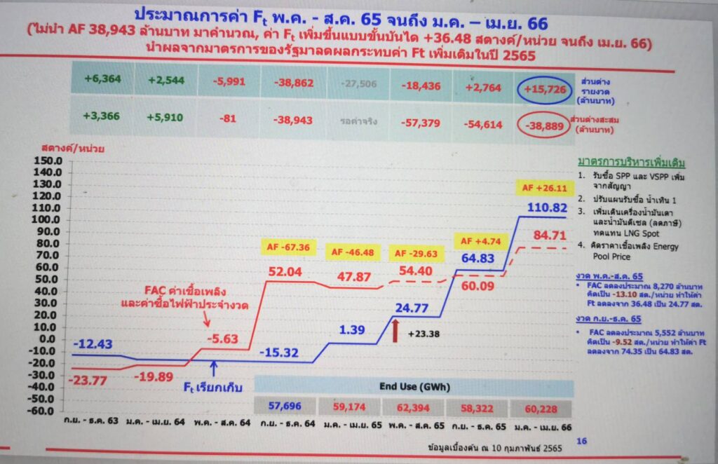 อย่างไรก็ตาม สำหรับงวดพ.ค. – ส.ค. 65 นั้น ต้นทุนเฉพาะเอฟทีงวดพ.ค.-ส.ค. 65 อยู่ที่ 67.50 สตางค์ต่อหน่วย และหากรวมกับเงินที่การไฟฟ้าฝ่ายผลิตแห่งประเทศไทย (กฟผ.) ร่วมรับภาระค่าไฟฟ้าให้ประชาชนในงวดที่ผ่านมาๆวงเงิน 38,943 ล้านบาท หรือ 62.41 สตางค์ต่อหน่วยแล้ว ต้นทุนค่าเอฟทีงวดนี้ที่แท้จริงจะอยู่ที่ 1.29 บาทต่อหน่วย แต่.คณะกรรมการบริหารกิจการพลังงาน (กกพ.) บริหารจัดงานโดยขอให้ กฟผ.ร่วมรับภาระเดิมไปก่อนยังไม่นำมาคำนวณรวมกับค่าไฟฟ้างวดนี้ แต่ประชาชนจะจ่ายคืนในค่าไฟฟ้าพร้อมดอกเบี้ยเมื่อไหร่อย่างไร ก็จะดูช่วงเวลาที่เหมาะสม รวมทั้งอาจจะเจรจากับ บมจ.ปตท.มาร่วมรับภาระเช่นลดค่าก๊าซให้บ้าง เป็นต้น และอีกส่วนหนึ่งที่ต้นทุนค่าเอฟทีงวดนี้ลดลงมาได้ การปรับขึ้นราคาแบบขั้นบันได และ การบริหารจัดการต้นทุนผลิตไฟฟ้าก็ช่วยลดค่าเอฟทีได้ราว 13 สตางค์ต่อหน่วย ประกอบไปด้วย ปรับโรงไฟฟ้าให้ใช้น้ำมันเตาและดีเซล ทดแทนการใช้ก๊าซธรรมชาติเหลว (แอลเอ็นจี) ได้ส่วนหนึ่งราววันละ 10 ล้านลิตร และรัฐบาลลดภาษีให้เป็นการชั่วคราว รวมทั้งหันไปซื้อโรงไฟฟ้าพลังงานทดแทนในประเทศเพิ่มขึ้นอีก 369.เมกะวัตต์เข้าระบบเมษายนนี้ การปรับสูตรการซื้อก๊าซเป็น Energy Pool Gas และการปรับแผนซื้อไฟฟ้าพลังงานสปป.ลาว “น้ำเทิน 1 “