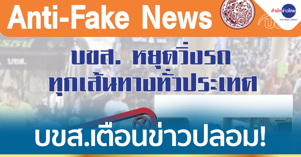นายสัญลักข์ ปัญวัฒนลิขิต กรรมการผู้จัดการใหญ่ บริษัท ขนส่ง จำกัด (บขส.) เปิดเผยว่า ตามที่มีสื่อโซเซียลมีเดียแชร์ข่าว “บขส.หยุดวิ่งรถทุกเส้นทางทั่วประเทศ เริ่มวันพรุ่งนี้” นั้น ขอแจ้งว่าข่าวดังกล่าวเป็น “ข่าวปลอม” บขส. ยังเปิดให้บริการเดินรถตามปกติ จึงขอให้ประชาชนอย่าหลงเชื่อและอย่าแชร์ข่าวปลอมดังกล่าว