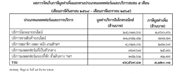 ทั้งนี้การจัดเก็บภาษี e-Service จากผู้ประกอบการต่างประเทศหรือแพลตฟอร์มออนไลน์ที่ให้บริการอิเล็กทรอนิกส์กับผู้ใช้บริการในประเทศไทย ตั้งแต่เดือนภาษีกันยายน 2564 – เดือนภาษีมกราคม 2565 จำนวนกว่า 3,000 ล้านบาท ในระยะเวลาเพียง 5 เดือนนั้น ทำให้คาดได้ว่าภายใน 1 ปี ทางกรมสรรพากรจะสามารถจัดเก็บภาษีมูลค่าเพิ่มได้จากแพลตฟอร์มผู้ให้บริการต่างประเทศประมาณ 8,000 – 10,000 ล้านบาท ซึ่งสูงกว่าที่เคยมีการคาดการณ์ไว้แต่เดิมว่าจะจัดเก็บได้ที่ประมาณ 5,000 ล้านบาท