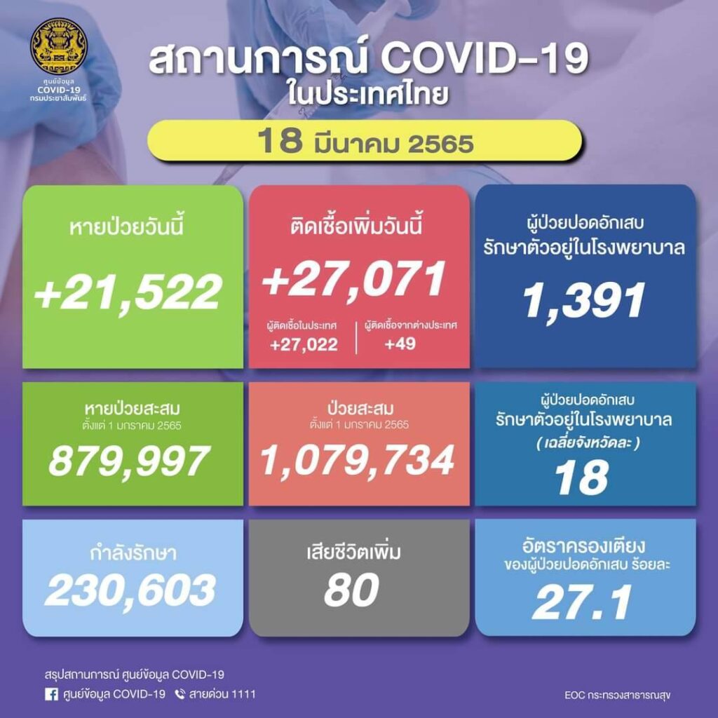 สำหรับสถานการณ์การแพร่ระบาดของโควิด-19 วันนี้ พบผู้ติดเชื้อโควิด-19 รายใหม่ รวม 27,071 ราย จำแนกเป็น ผู้ป่วยจากในประเทศ 27,022 ราย ผู้ป่วยมาจากต่างประเทศ 49 ราย ผู้ป่วยสะสม 1,079,734 ราย (ตั้งแต่ 1 มกราคม 2565) หายป่วยกลับบ้าน 21,522 ราย หายป่วยสะสม 879,997 ราย (ตั้งแต่ 1 มกราคม 2565) ผู้ป่วยกำลังรักษา 230,603 ราย เสียชีวิต 80 ราย จำนวนผู้ป่วยปอดอักเสบ รักษาตัวอยู่ในโรงพยาบาล 1,391 ราย เฉลี่ยจังหวัดละ 18 ราย อัตราครองเตียง ร้อยละ 27.1 ขณะที่ยอดการฉีดวัคซีนโควิด-19 วันนี้ รวมฉีดสะสม อยู่ที่ 126,937,886 โดส เข็มที่ 1 ฉีดสะสม 54,725,564 โดส เข็มที่ 2 ฉีดสะสม 50,055,180 โดส เข็มที่ 3 ฉีดสะสม 20,232,148 โดส และเข็มที่ 4 ฉีดสะสม 1,924,994 โดส.- สำนักข่าวไทย
