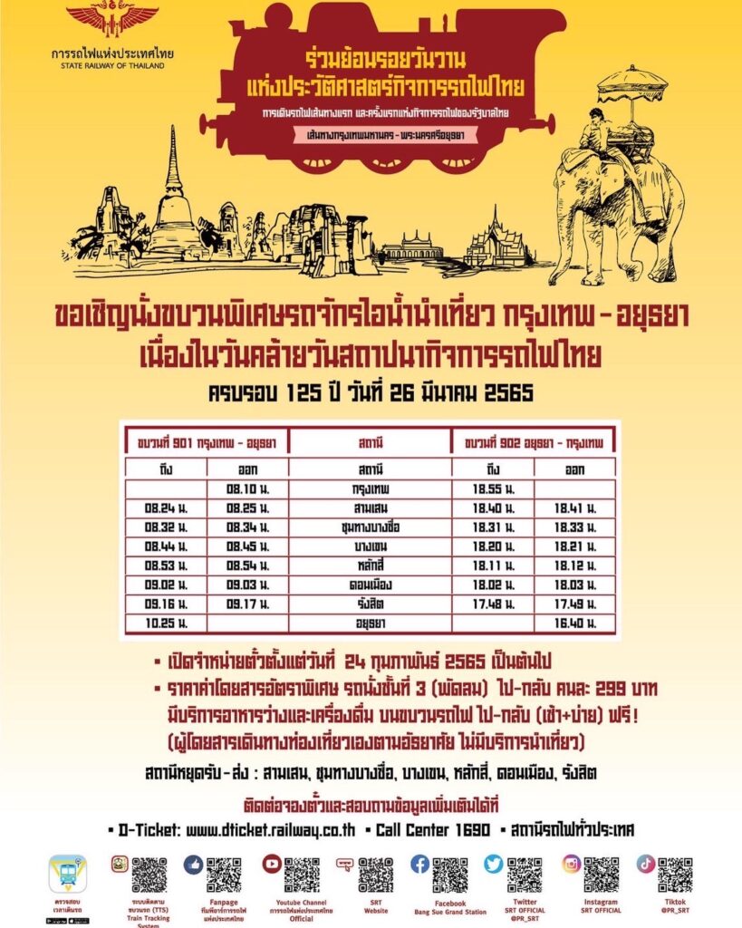 นายเอกรัช ศรีอาระยันพงษ์ ผู้อำนวยการศูนย์ประชาสัมพันธ์ การรถไฟแห่งประเทศไทย เปิดเผยว่า ตามที่การรถไฟฯ ได้จัดเดินขบวนพิเศษรถจักรไอน้ำนำเที่ยว เส้นทางกรุงเทพฯ-พระนครศรีอยุธยา เนื่องในโอกาสวันคล้ายวันสถาปนากิจการรถไฟ ครบรอบ 125 ปี วันที่ 26 มีนาคม 2565 โดยเปิดให้ประชาชน นักท่องเที่ยว ได้ร่วมเป็นส่วนหนึ่งของการเดินทางศึกษาเส้นทางประวัติศาสตร์ของไทย เพื่อร่วมน้อมรำลึกในพระมหากรุณาธิคุณของพระบาทสมเด็จพระจุลจอมเกล้าเจ้าอยู่หัว รัชกาลที่ 5 ที่พระองค์ทรงพระกรุณาโปรดเกล้าฯ ให้เปิดการเดินรถไฟเป็นปฐมฤกษ์จากกรุงเทพฯ ไปยังจังหวัดพระนครศรีอยุธยา เป็นครั้งแรก เมื่อวันที่ 26 มีนาคม 2439