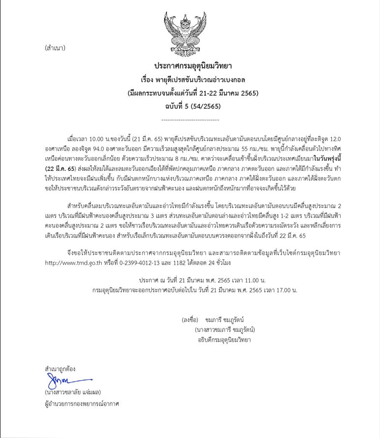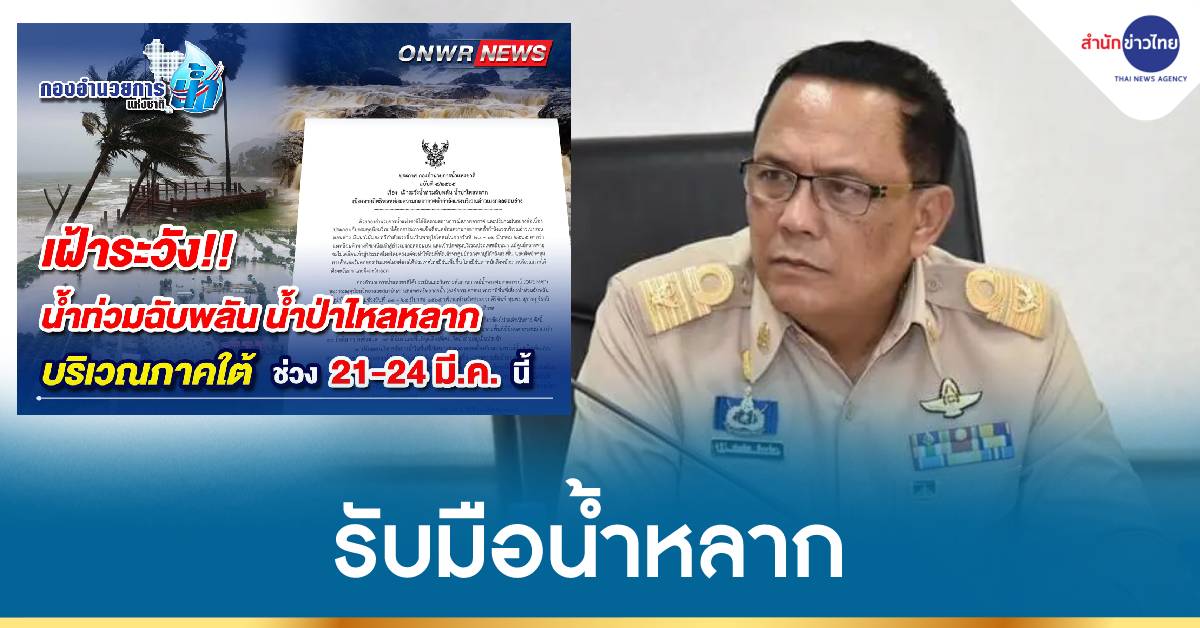 นายประพิศ จันทร์มา อธิบดีกรมชลประทานเปิดเผยว่า สั่งการให้ทุกโครงการชลประทานเตรียมพร้อมรับสถานการณ์น้ำหลากเนื่องจากกรมอุตุนิยมวิทยาประกาศแจ้งเตือนพายุดีเปรสชันบริเวณอ่าวเบงกอล คาดว่า จะเคลื่อนเข้าขึ้นฝั่งบริเวณประเทศเมียนมาในวันพรุ่งนี้ (22 มี.ค.) ซึ่งจะทำให้มีฝนตกหนักในภาคเหนือ ภาคกลาง ภาคใต้ฝั่งตะวันออก และภาคใต้ฝั่งตะวันตก โดยต้องเฝ้าระวังเป็นพิเศษในพื้นที่เสี่ยงตามประกาศของกองอำนวยการน้ำแห่งชาติ (กอนช.) ซึ่งประเมินว่า มีพื้นที่เสี่ยงน้ำท่วมฉับพลันและน้ำป่าไหลหลากในช่วงวันที่ 21 – 24 มี.ค. บริเวณจังหวัดประจวบคีรีขันธ์ ชุมพร สุราษฎร์ธานี นครศรีธรรมราช สงขลา พัทลุง กระบี่ พังงา ตรัง ปัตตานี ยะลา และนราธิวาส