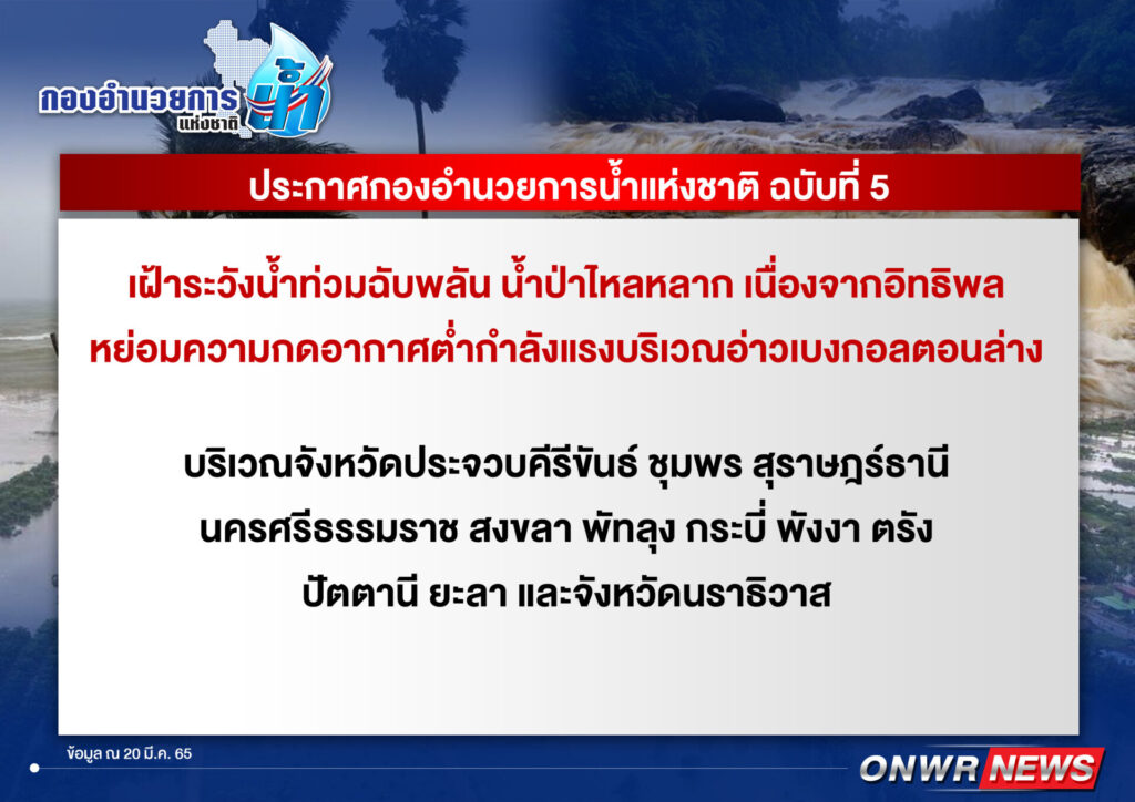 กองอำนวยการน้ำแห่งชาติ (กอนช.) ออกประกาศก่อนหน้านี้ว่า ได้ติดตามสถานการณ์สภาพอากาศ และปริมาณฝนอย่างต่อเนื่อง ประกอบกับกรมอุตุนิยมวิทยาออกประกาศแจ้งเตือนพายุดีเปรสชันบริเวณอ่าวเบงกอลซึ่งกำลังจะเคลื่อนเข้าปกคลุมประเทศเมียนมา แม้ศูนย์กลางพายุจะไม่เคลื่อนเข้าสู่ประเทศไทยโดยตรง แต่จะทำให้ลมที่พัดเข้าหาศูนย์กลางพายุมีกำลังแรงขึ้นและพัดปกคลุมทางด้านตะวันตกของประเทศไทยส่งผลให้ประเทศไทยมีฝนเพิ่มขึ้น โดยมีฝนตกหนักถึงหนักมากบริเวณภาคใต้ทั้งฝั่งตะวันตกและฝั่งตะวันออก