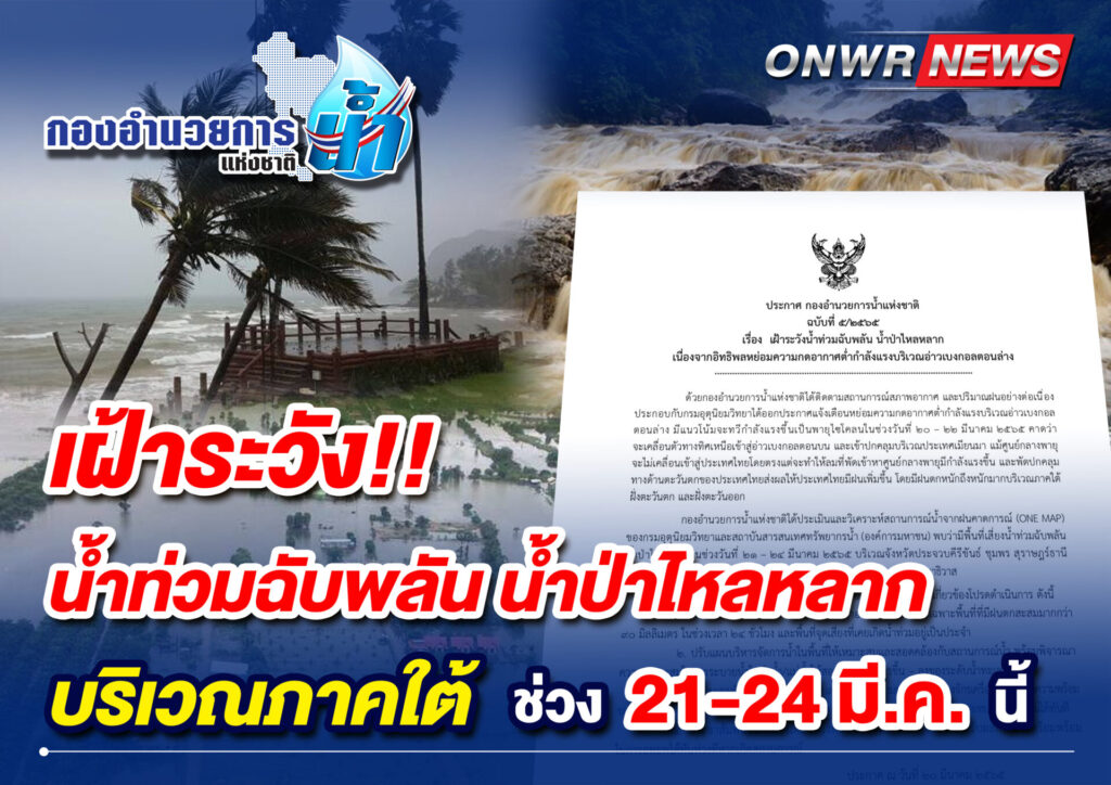 กรุงเทพฯ 21 มี.ค. – อธิบดีกรมชลประทานสั่งเฝ้าระวังน้ำหลากเนื่องจากมีฝนตกหนักจากพายุดีเปรสชั่นบริเวณอ่าวเบงกอล ด้าน กอนช. แจ้งเตือนพื้นที่เสี่ยง 12 จังหวัดระหว่าง 21-24 มี.ค.นี้