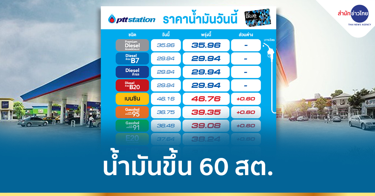 โดยราคาขายปลีกจะเป็นดังนี้ ULG = 46.76, GSH95 = 39.35, E20 = 38.24, GSH91 = 39.08, E85 = 31.54, HSD- B7= 29.94, HSD-B10 = 29.94, HSD-B20=29.94,ดีเซลพรีเมี่ยม B7 = 35.96 บาทต่อลิตร โดยราคาขายปลีกข้างต้นยังไม่รวมภาษีบำรุงกรุงเทพมหานคร .-สำนักข่าวไทย