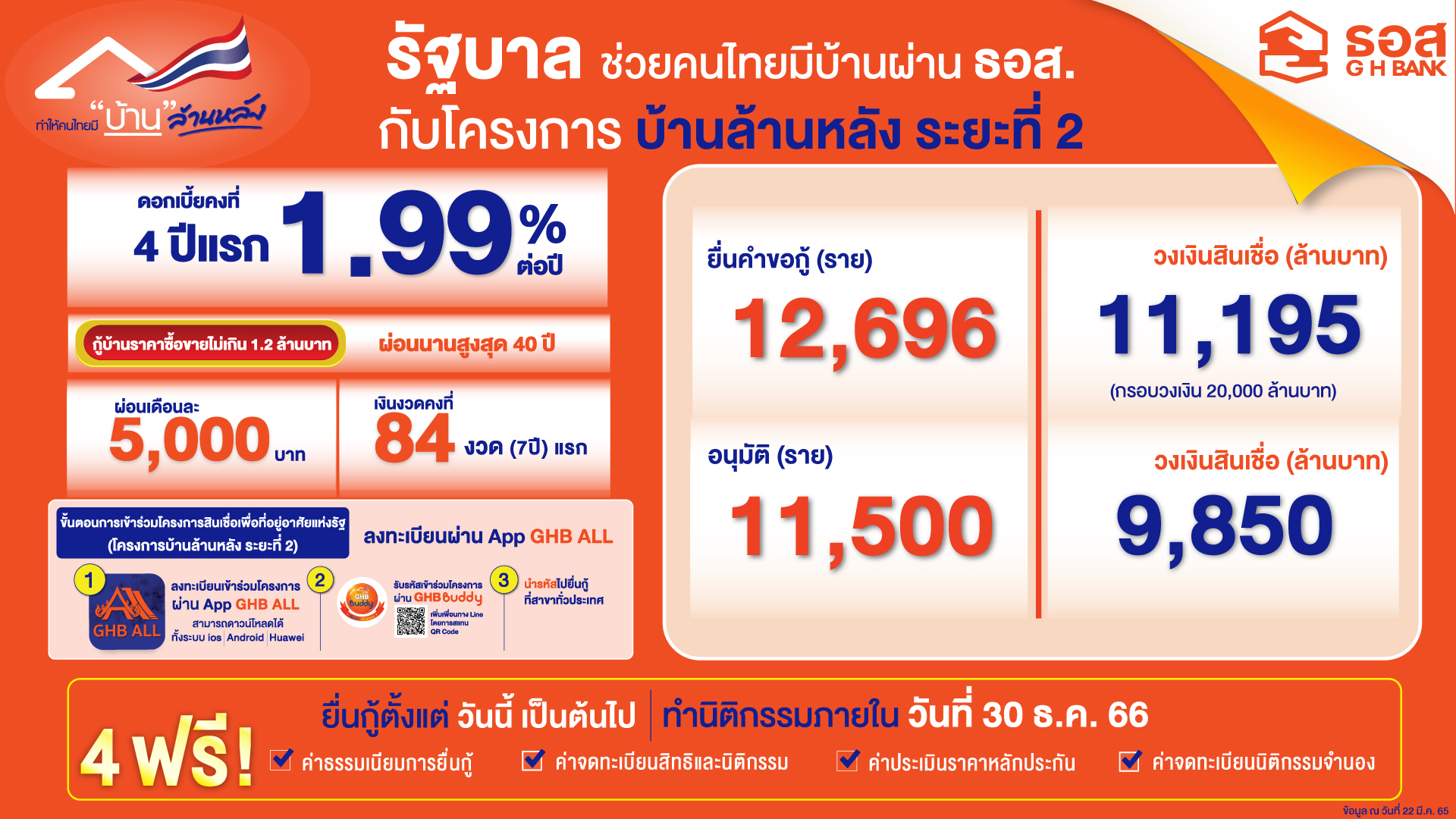 ทั้งนี้ ประชาชนที่สนใจยังสามารถลงทะเบียนผ่าน Mobile Application : GHB ALL เพื่อเข้าร่วมโครงการได้อย่างต่อเนื่อง เพราะโครงการบ้านล้านหลัง ระยะที่ 2 จะสิ้นสุดยื่นคำขอกู้และทำนิติกรรมในวันที่ 30 ธันวาคม 2566 หรือ เมื่อมีลูกค้าได้รับอนุมัติสินเชื่อและทำนิติกรรมเต็มกรอบวงเงิน 20,000 ล้านบาท -สำนักข่าวไทย
