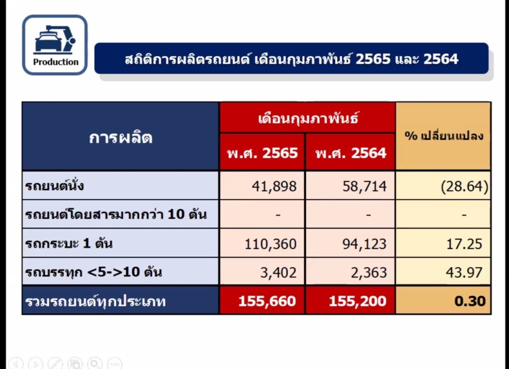 นายศุภรัตน์ ศิริสุวรรณางกูร ประธานกิตติมศักดิ์กลุ่มอุตสาหกรรมยานยนต์ สภาอุตสาหกรรมแห่งประเทศไทย (ส.อ.ท.) และนายสุรพงษ์ ไพสิฐพัฒนพงษ์ รองประธานและโฆษกกลุ่มอุตสาหกรรมยานยนต์ สภาอุตสาหกรรมแห่งประเทศไทย (ส.อ.ท.) เปิดเผยจำนวนการผลิต ยอดขายภายในประเทศ และการส่งออกรถยนต์และรถจักรยานยนต์ของประเทศ ในเดือนกุมภาพันธ์ 2565 โดยรถยนต์ที่ผลิตได้ในเดือนกุมภาพันธ์ 2565 มีทั้งสิ้น 155,660 คัน เพิ่มขึ้นจากเดือนกุมภาพันธ์ 2564 ร้อยละ 0.30 และเพิ่มขึ้นจากเดือนมกราคม 2564 ร้อยละ 2.58 โดยเป็นการเพิ่มขึ้นจากการผลิตรถกระบะขายในประเทศและผลิตส่งออกที่เพิ่มขึ้นร้อยละ 27.82 และ 10.95 แต่การผลิตรถยนต์นั่งลดลงร้อยละ 28.64 จากการการขาดแคลนชิปและชิ้นส่วนในบางรุ่น และยังกังวลว่าการขาดแคลนชิปและชิ้นส่วนอาจรุนแรงขึ้นจากสงครามยูเครน จึงต้องติดตามอย่างใกล้ชิด